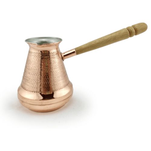 Турка медная.Чеканка, толщина меди 1мм, внутри покрыта пищевым оловом толщиной 9-12мкм, внешне покрыта термостойким никелем. Медь обладает равномерной теплопроводностью, а сама турка имеет самое узкое горлышко, что для приготовления кофе немаловажно. Медная турка имеет специальное внутреннее покрытие из пищевого олова. Медные турки лучше подчеркивают вкус и аромат кофе, а также позволяют распределить тепло равномерно по всей поверхности сосуда, избавив кофе от подгорелого привкуса.