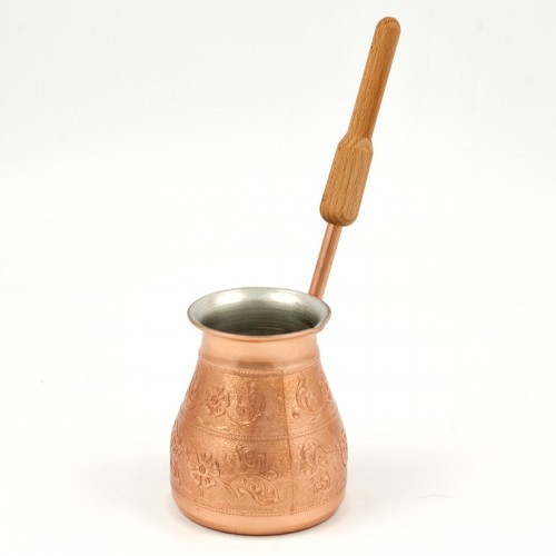Это качественная турка из листовой меди толщиной 1.2 мм, изготовленная по цельнокатанной технологии. Для защиты от внешних воздействий, внутренние стенки и дно турки покрыты пищевым оловом, толщиной 9-12 мкм. Внешние стенки покрыты жаропрочным лаком и имеют натуральный медный блеск.