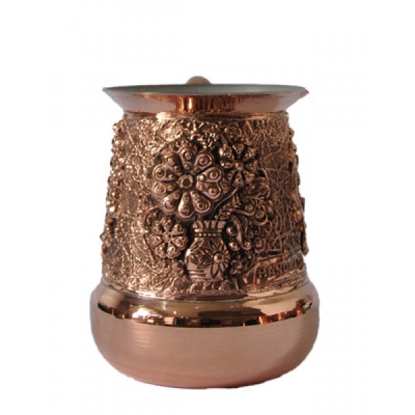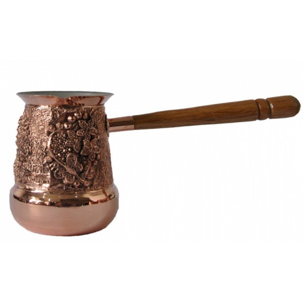 Красивая медная турка "Весенняя" с удобной длинной деревянной ручкой. Изготовлена вручную мастерами Армении из листа чистой меди толщиной 1 мм. Эксклюзивная чеканка с изображением весенних цветов. Внутри турка покрыта пищевым оловом, имеет толстое дно и стенки. Подходит для приготовления кофе на электрических и газовых плитах, а так же других нагревающих поверхностях.
