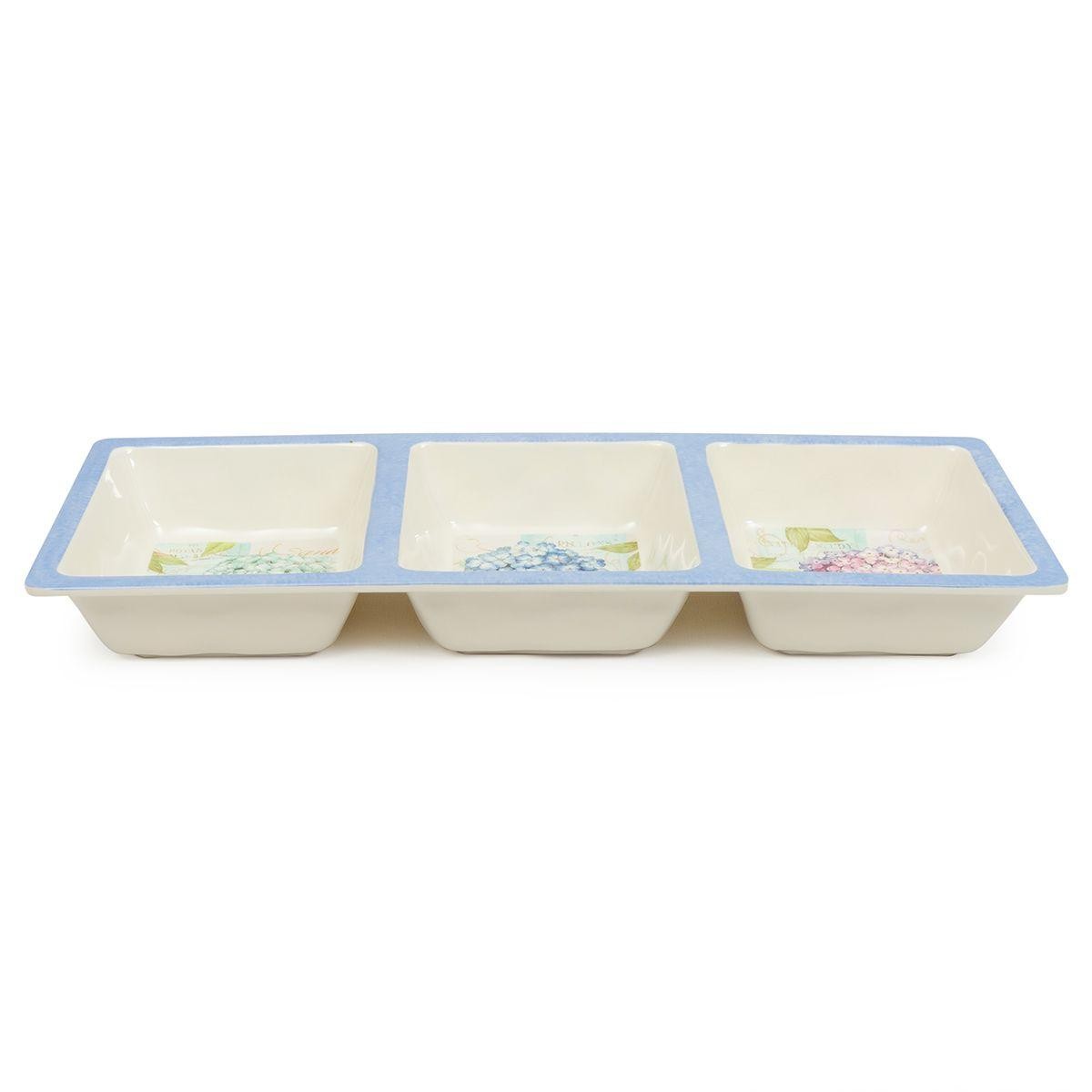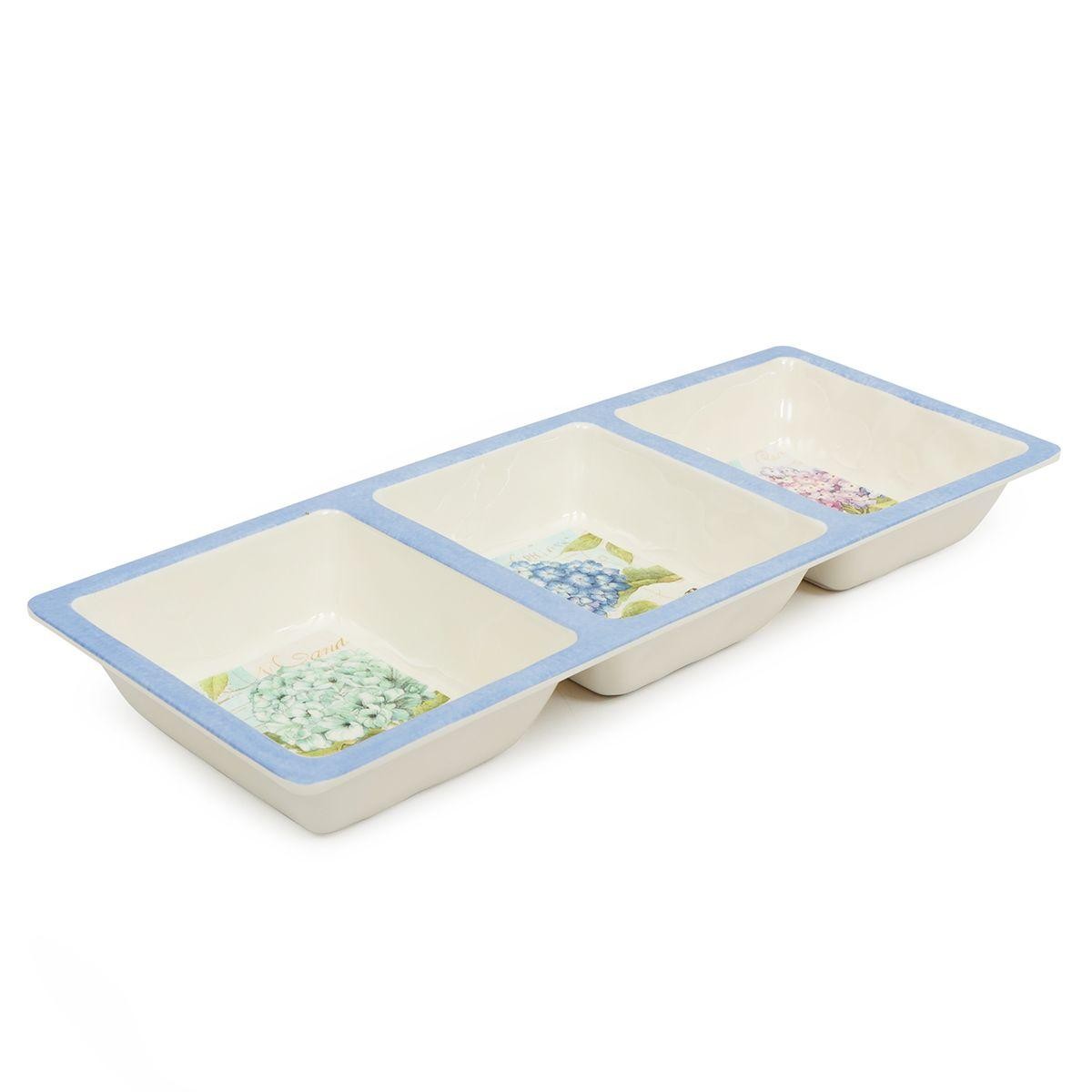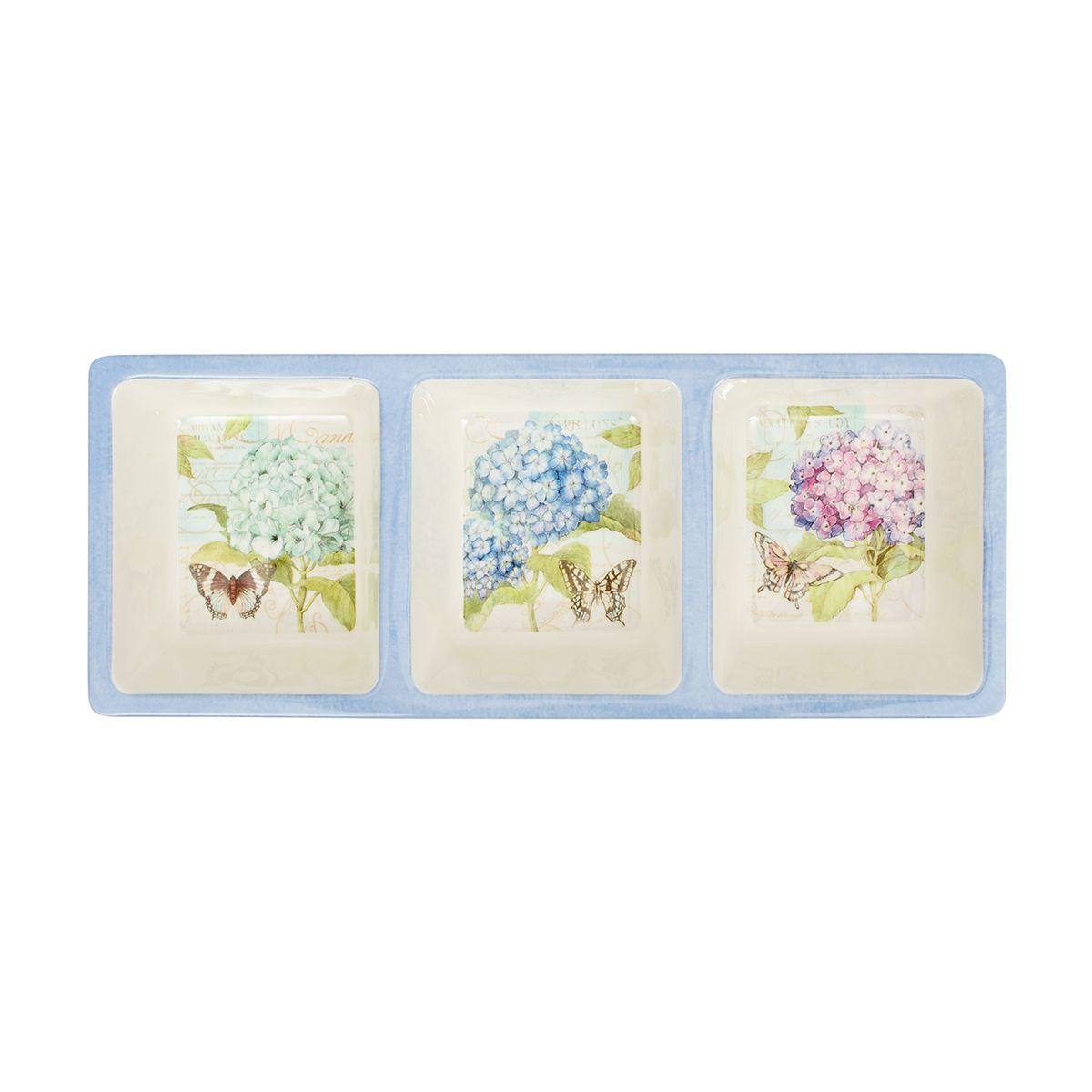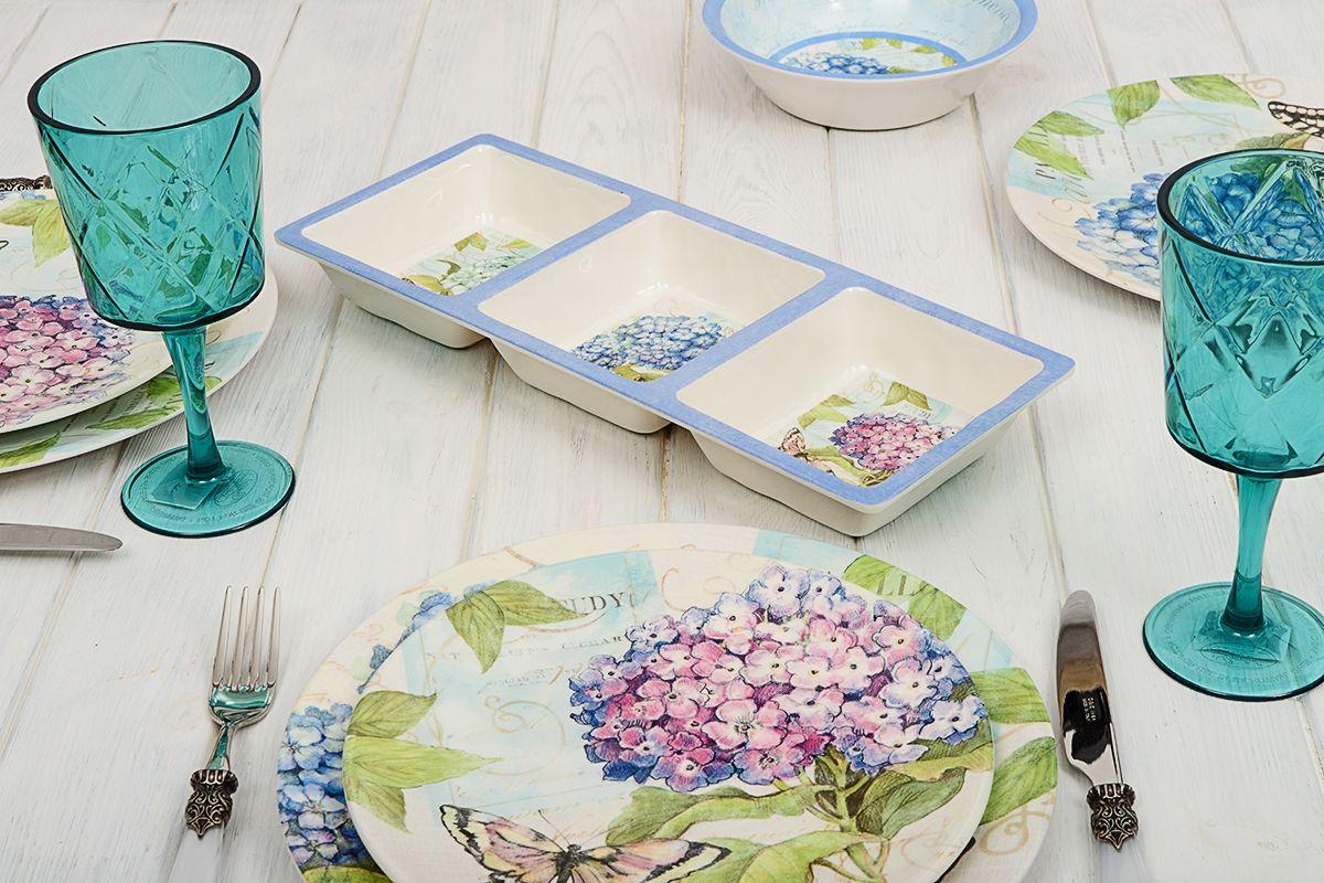 Восхитительная менажница на три секции из коллекции «Гортензии» сразу привлекает к себе внимание. На каждой из трех частей изображена пышная цветущая гортензия голубого, синего и лилового цвета с красивой бабочкой. Уникальный дизайн изделия придумала и воплотила художница из Америки Сьюзан Уингет.Менажница выполнена из прочного меламина, хотя выглядит, как дорогая элитная керамика. Материал очень прочный, не разбивается при падении, а также абсолютно безопасный для здоровья. Изделие удобно использовать для красивой сервировки на природе и на пикниках. В менажнице можно подавать различные соусы и кетчупы, ягоды, орешки или сухофрукты.