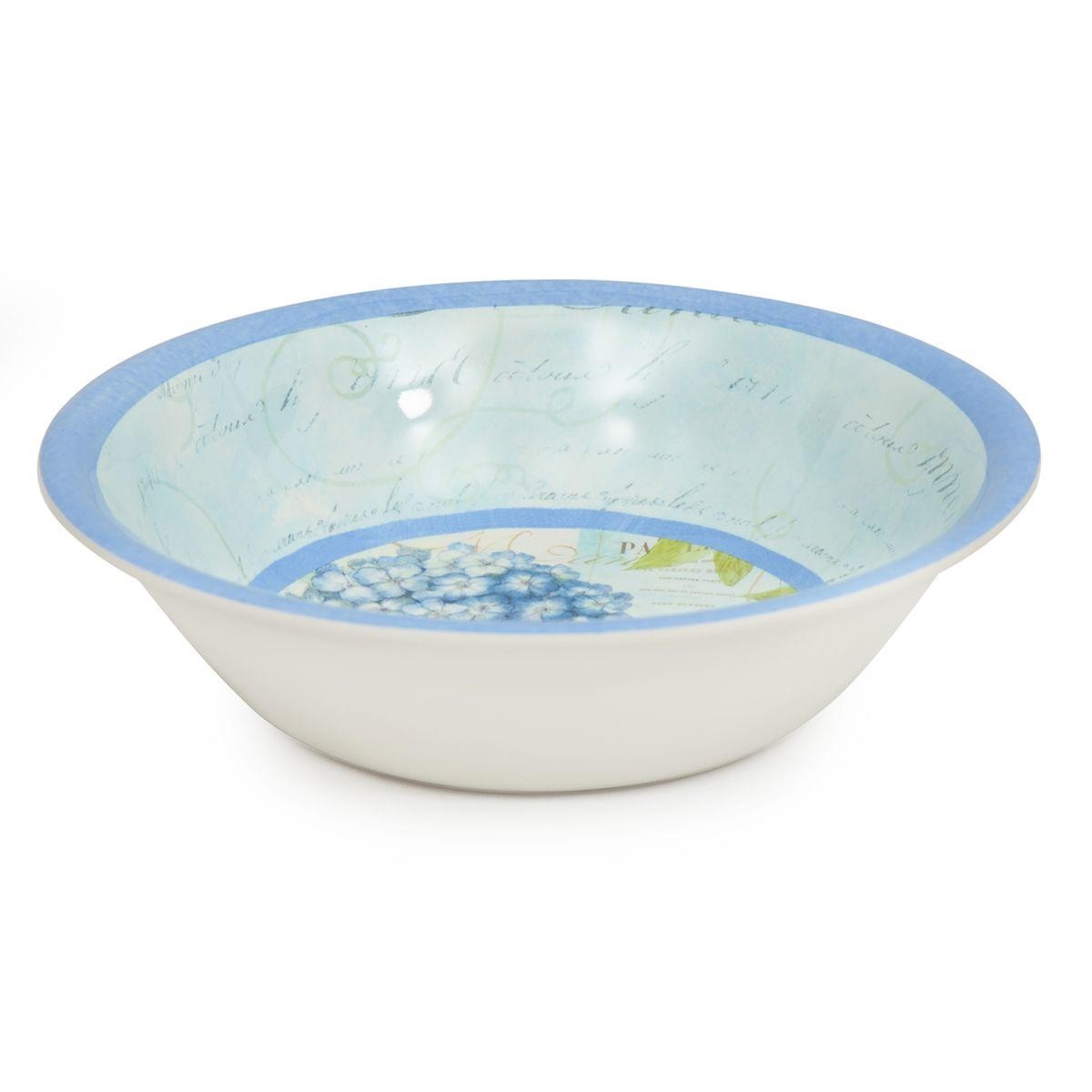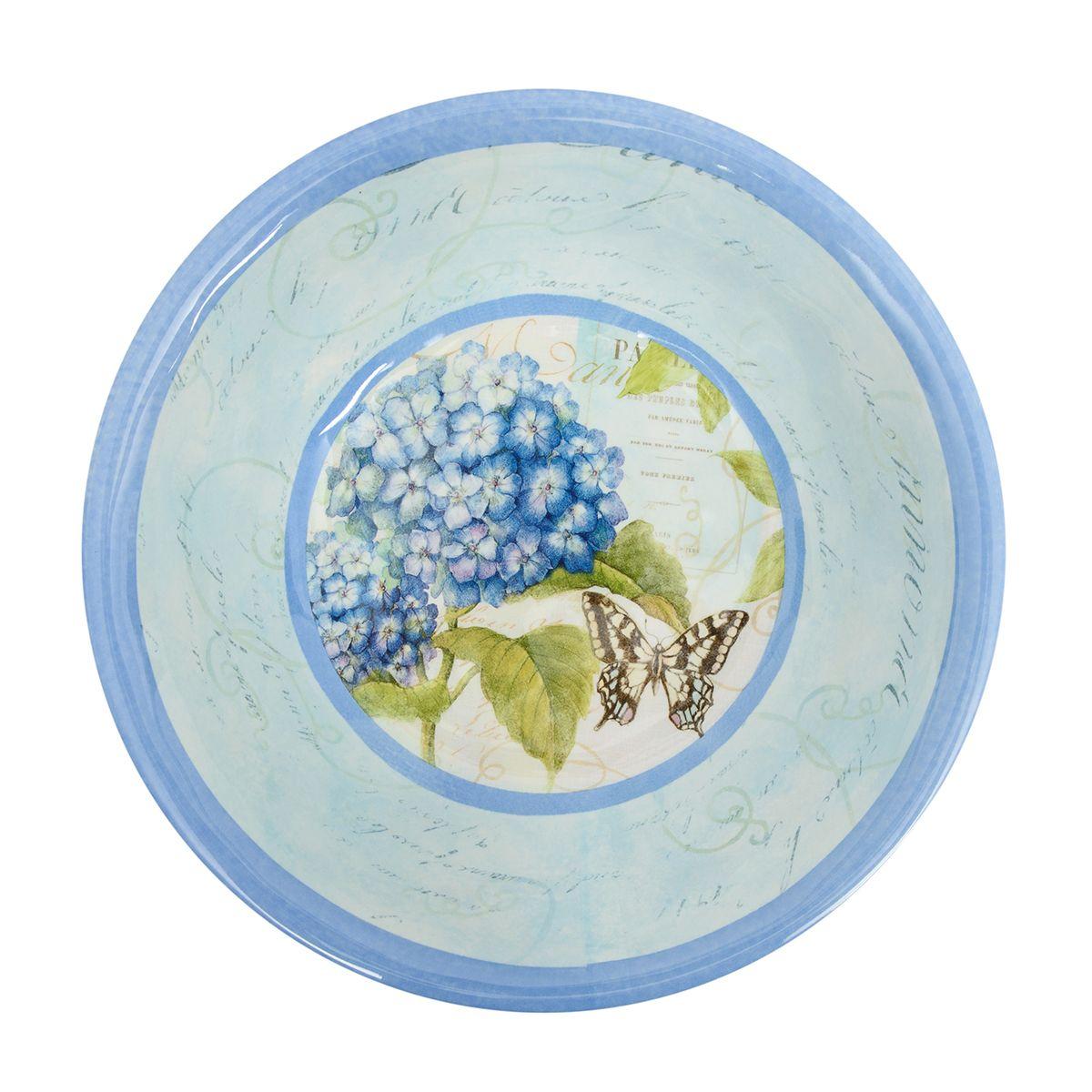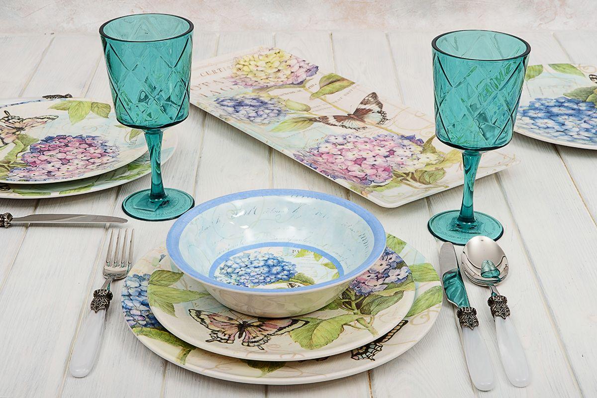 Супові тарілки з колекції Гортензії виглядають як розкішна порцеляна. Але насправді вони виконані з безпечного, ударостійкого матеріалу, який називається меламін. З такими тарілками навіть біля озера на пікніку або в лісі сервірування вийде вишуканим. Унікальний дизайн посуду цієї колекції розробила відома американська художниця Сьюзан Уінгет. На ніжно-блакитному тлі в центрі тарілки зображено пишну блакитну гортензію, над якою кружляє легкокрилий метелик. Матеріал, з якого виконані тарілки є абсолютно безпечним, що підтверджується сертифікатами якості.