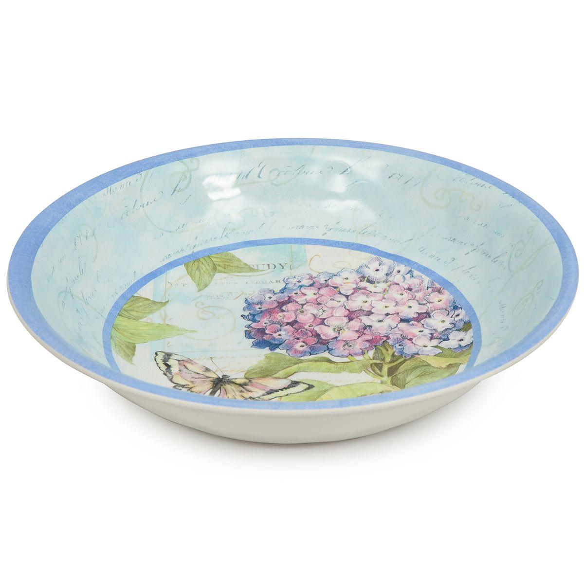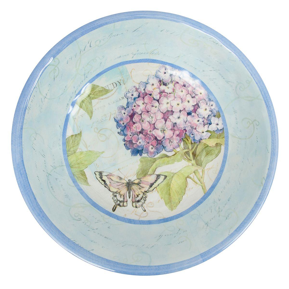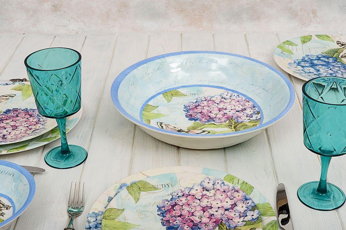 Меламиновый салатник придется по душе эстетам, которые любят проводить трапезы и пикники на свежем воздухе. Салатник выполнен в нежно-голубых тонах с великолепной композицией из роскошной лиловой гортензии и порхающей бабочки. Дизайн коллекции подготовила популярная художница из Америки Сьюзан Уингет. Принт высокого качества отображает рисунок, написанный в акварельной технике, просто идеально. Посуда из качественного прочного меламина выглядит как премиальная дорогая керамика. Она не бьется, экологичная, безопасная для здоровья, не впитывает в себя запахи еды. В глубокой тарелке удобно подавать к столу овощные салаты, пасту, ризотто, рагу, жаркое и различные блюда с наличием густого соуса.