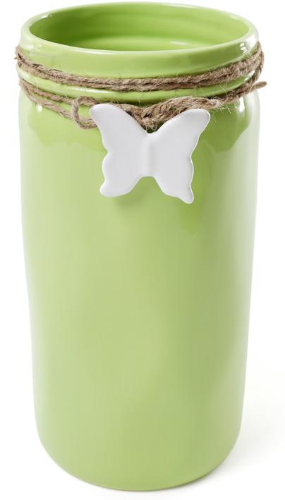 Керамічна ваза з колекції Flowers Garden зеленого кольору, Оригінальна настільна ваза для квітів, зроблена у формі зеленої банки з різьбленням на шийці, Підвісний керамічний декор Білий метелик на коричневій мотузці, Діаметр вази 13см, висота - 26см
