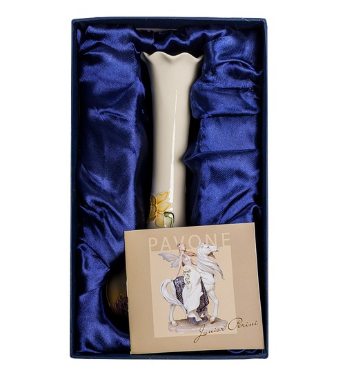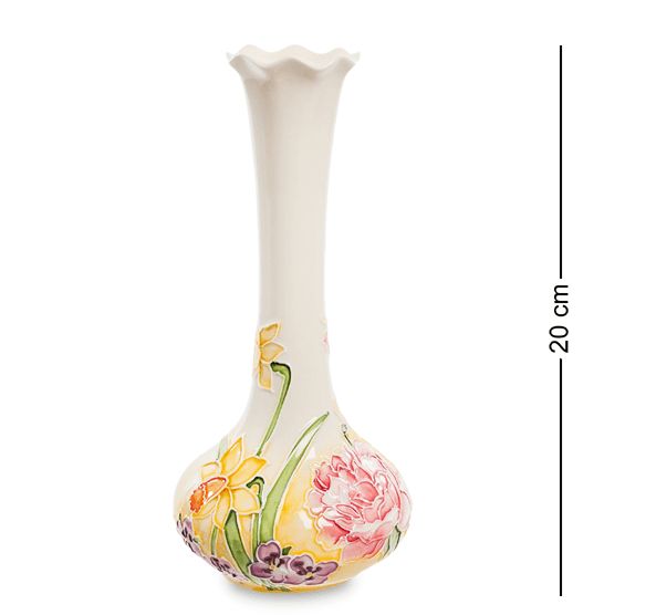 Фарфорова ваза має витончену видовжену форму, розширюючись донизу, утворює стійку основу, яка не дозволить вазі перевернутися. Розписана весняними квітами ваза сама по собі представляє предмет мистецтва. У ній чудово розставлені акценти: спочатку увагу привертає величезний рожевий півонія, потім погляд приковує пара нарцисів і, вже наприкінці, звертаєш увагу на маленьку фіалку праворуч.