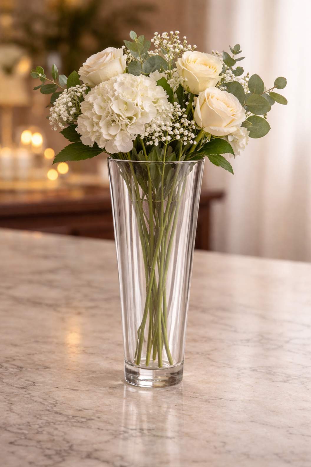Благодаря своей форме и размеру ваза идеально подходит как для одиночных высоких цветов, так и для небольших букетов. Она легко впишется в любую обстановку – от домашней гостиной до офисного пространства.