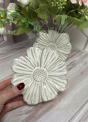 Эти керамические вазы будто созданы самой природой. Миниатюрные, но выразительные, они повторяют очертания лепестков: одна — нежной ромашки, другая — горделивой хризантемы. Объемный рельеф, приятная матовая поверхность и мягкий оттенок цвета делают их не просто аксессуаром, а центром визуального акцента.