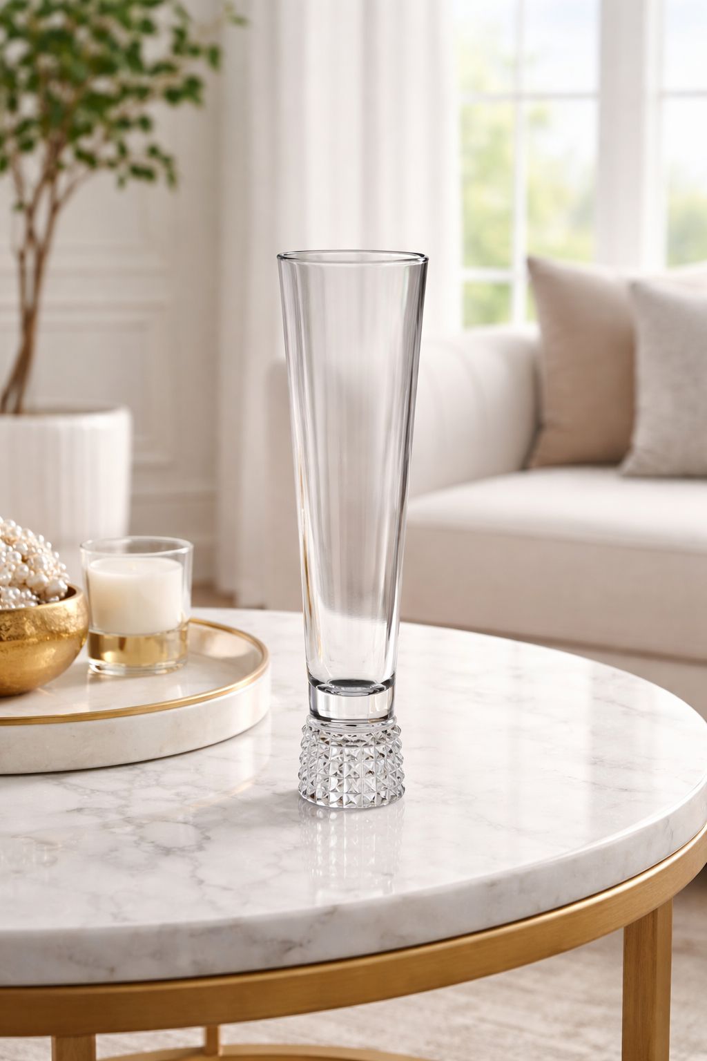 Строга геометрія та чистота ліній роблять цю вазу справжнім втіленням сучасного смаку. Витягнутий силует переходить у масивну основу з фактурним декором, що нагадує відблиски міського скла — чіткі, впевнені, структурні.