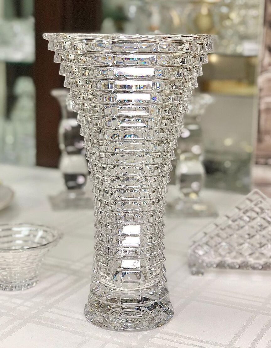 Висота 30 см дозволяє вазі бути універсальною: вона ідеально підходить для великих букетів з троянд, півоній, декоративної зелені або навіть сухих композицій. Ваза стійка, важка, з товстим дном — її не так просто перекинути, а прозорість кришталю відкриває красу кожної гілочки.