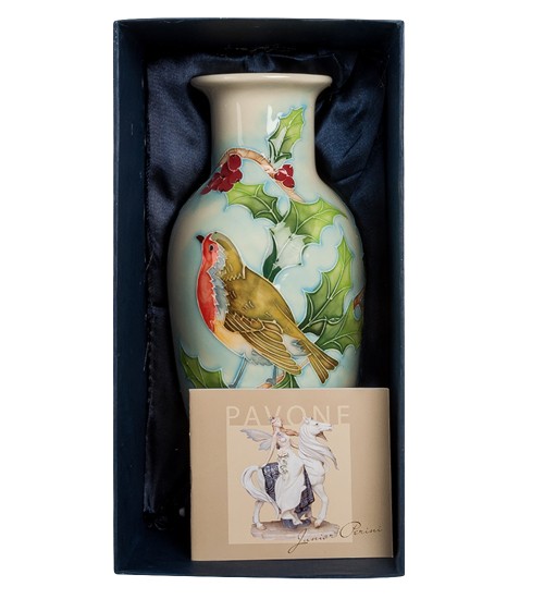 На вазі зображений сніговик, що сидить на гілочці ягідного дерева. У снігу темно-зелене оперення, червона грудка і жовтий пух на животі. Птаха оточують зелене листя і невеликі грона червоних ягід, які художник розкидав по всьому простору малюнка. Снігур та дерево зображені на світло-блакитному «сніговому» фоні. 22-сантиметрова ваза зі снігурем – чудовий предмет, яким можна прикрасити світлу, обставлену білими меблями кімнату. Вазу можна подарувати на новосілля, день народження чи ювілей.