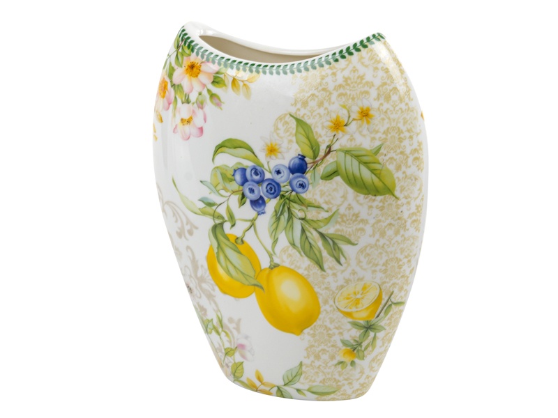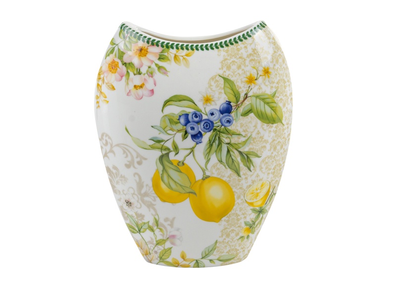 Фарфорова ваза «Лимон» висотою 25,5 см — це справжня прикраса інтер’єру, що наповнює простір свіжістю та сонячним настроєм. На білосніжній поверхні розквітає вишукана композиція з лимонів, чорниць і квітучих гілочок, яка створює відчуття південного саду в розпал літа. Ніжне поєднання жовтих, зелених і блакитних відтінків робить виріб живим, яскравим і легким, ніби воно дихає ароматами цитрусів і квітів.