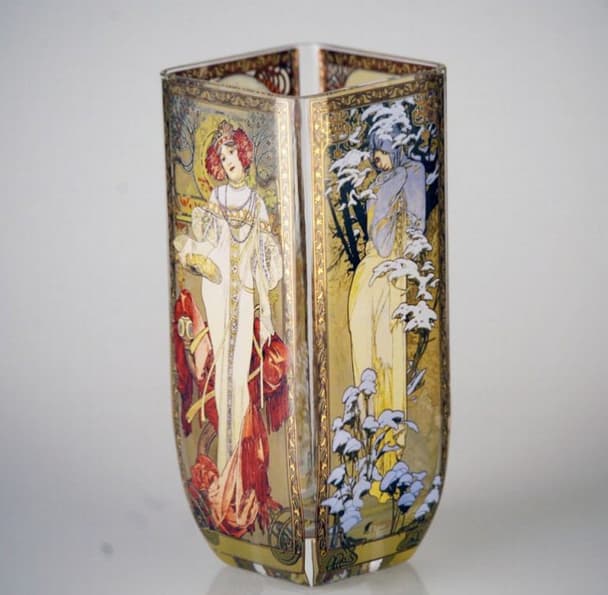 Прекрасная декоративная ваза в интерьере гостиной подчеркнет не только безупречный вкус хозяина, но и внесет роскошь и стиль в окружающую обстановку. Мастера немецкого бренда Goebel перенесли на стекло женские образы, изображающие различные времена года, по мотивам женских портретов известного чешского художника Альфонса Мирия Муха, созданных в 1900 году.