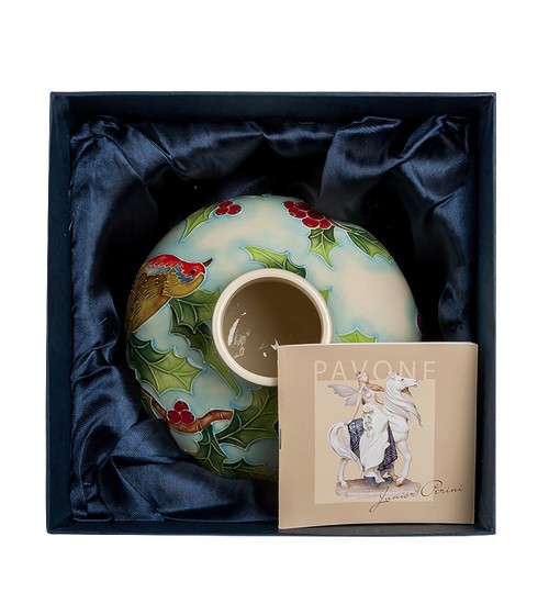 Фарфоровая ваза может стать прекрасной основой для красивого букета, но она и сама прекрасна! Как будто кусочек голубого неба с пятнами облаков виден сквозь фарфор, украшенный яркими зелеными листьями и красными ягодами. Красивая птичка с красной грудкой прилетела в этот дивный сад, чтобы полакомиться ягодами и позволить всем присутствующим рассмотреть ее красивое оперение.