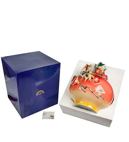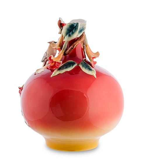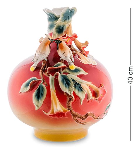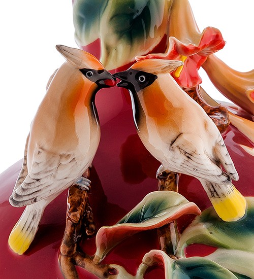 Однак апофеоз краси цього виробу проявляється у ніжно воркуючих птахах, які мешкають між ароматними бутонами та наповнюють композицію своєю любов'ю. Окреме захоплення викликає колірна гама вази: рожеві, жовті, помаранчеві, сині та зелені відтінки плавно перетікають один в одного, роблячи вазу надзвичайно гармонійною інтер'єрною прикрасою.