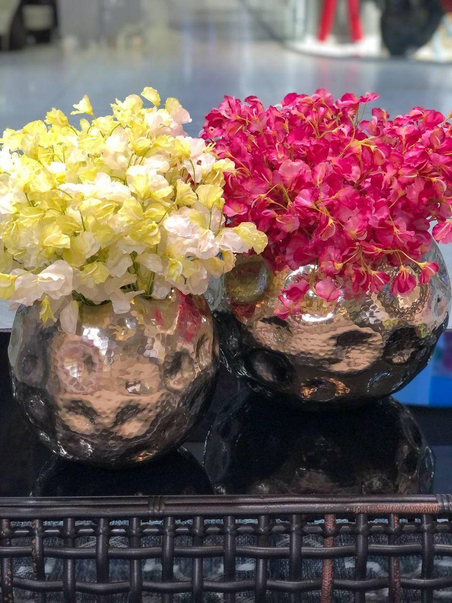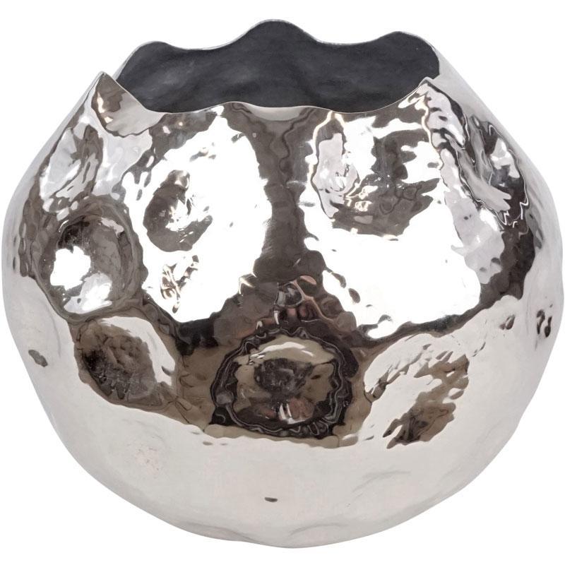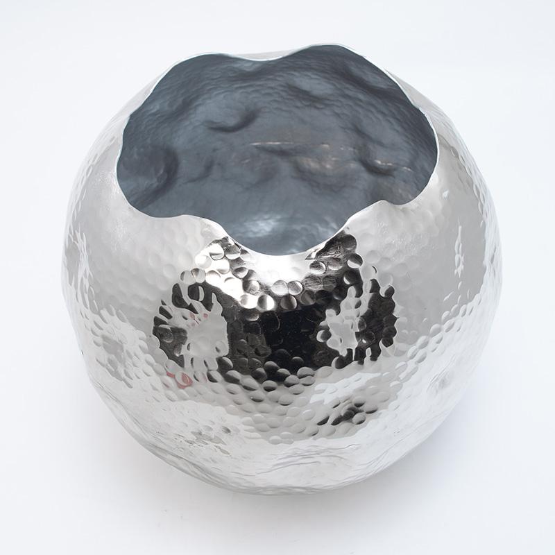Металева ваза, стилізована під кулю з м'ятою поверхнею. Такий неординарний декор може успішно використовуватися в сучасних урбаністичних інтер'єрах, а також як сміливий неординарний акцент у класичному дизайні. Товсті міцні стінки зовні покриті сяючим сріблястим шаром, що підкреслює нерівну фактуру. Усередині поверхня залишається матовою. Вазу можна мити і наливати в неї воду - високоякісний метал не схильний до окислення. Ця стильна кулька може стати чудовою основою для букета або окремим декоративним елементом інтер'єру.