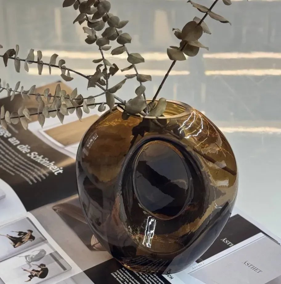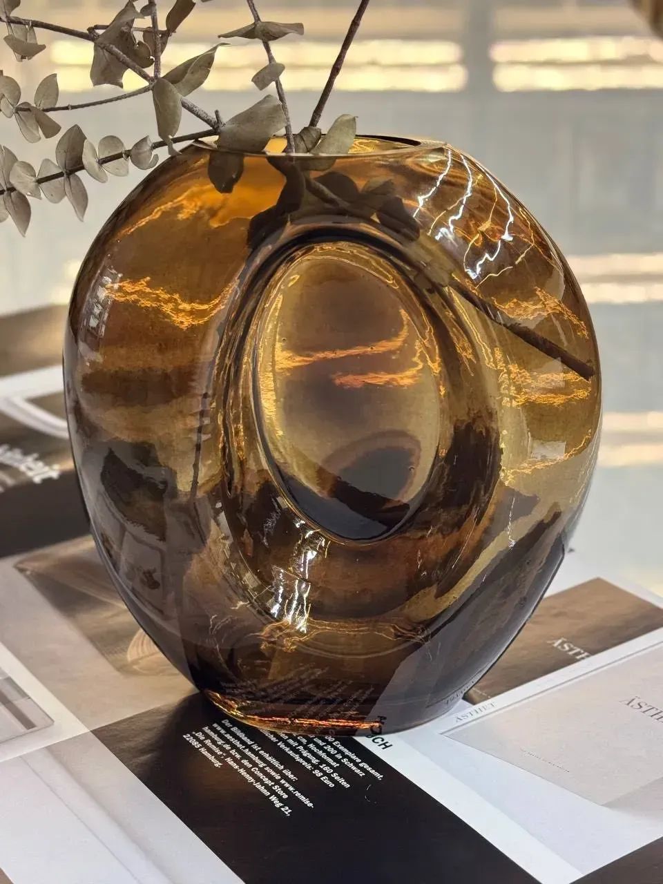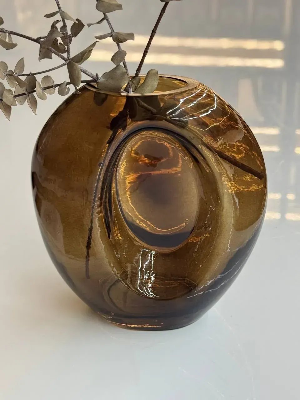 Кожна з цих ваз — не просто посудина, а художнє висловлювання. Їхні органічні форми з отворами, що притягують погляд, створюють ефект руху. Матове або прозоре скло в бурштинових і смарагдових відтінках дивує, граючи зі світлом.