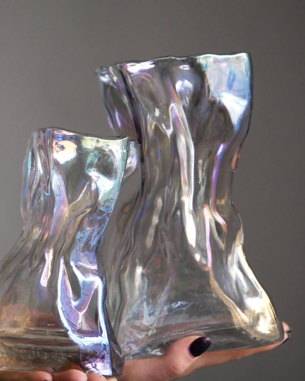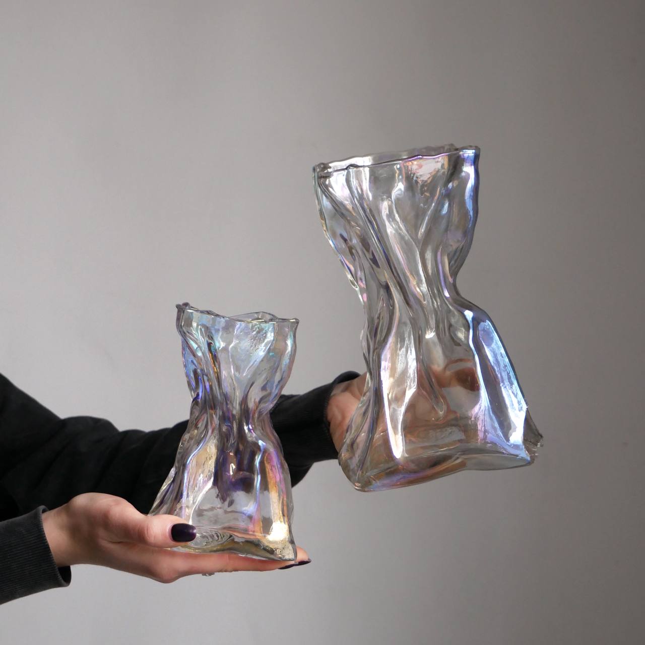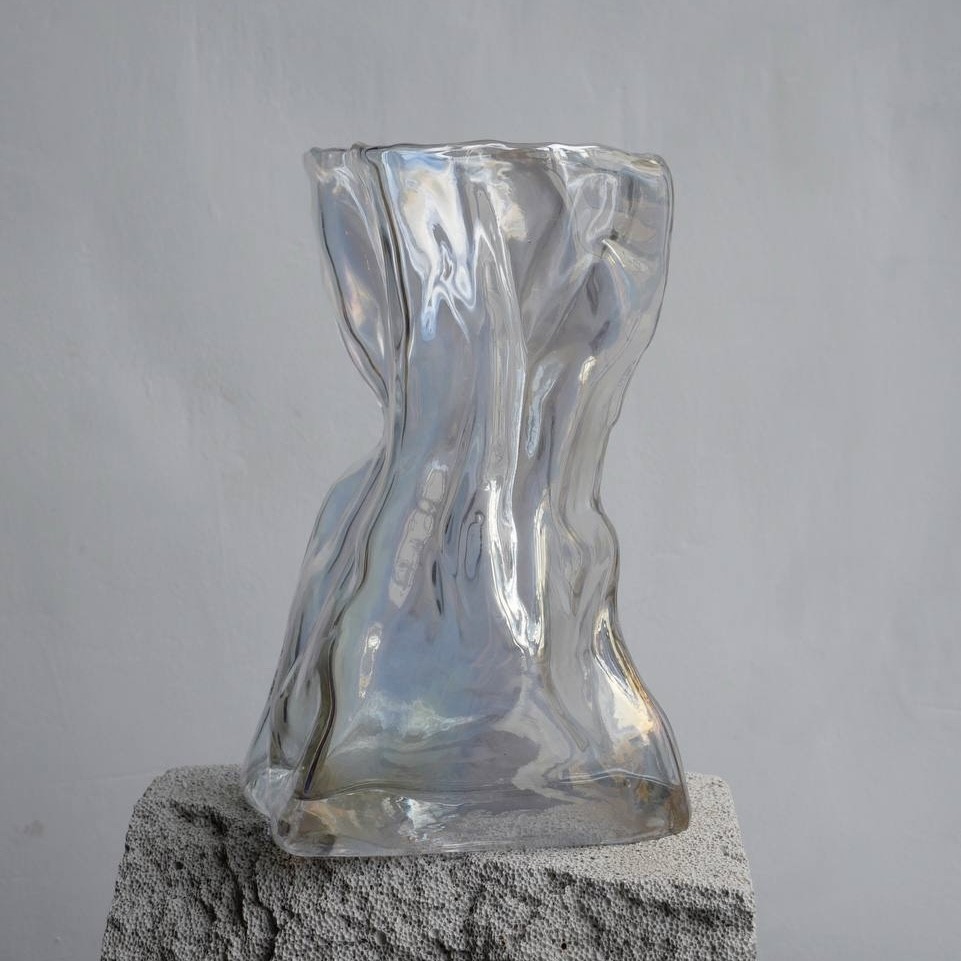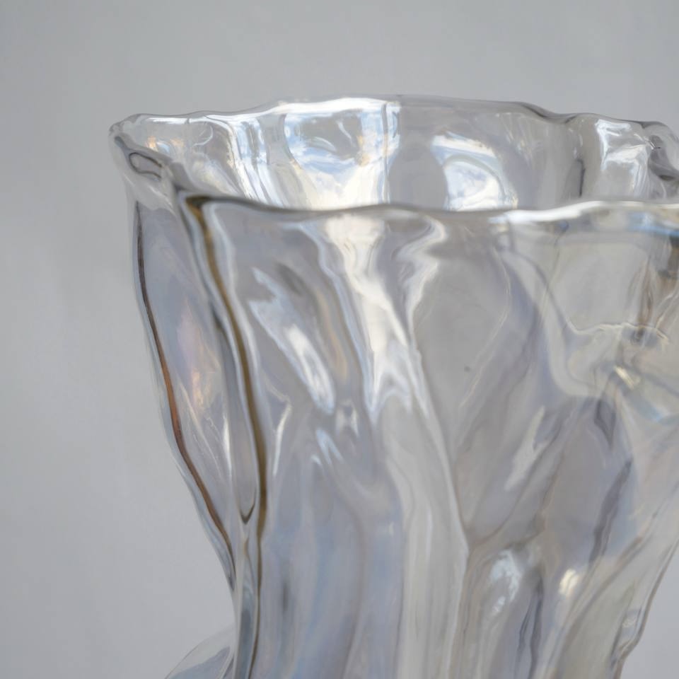 Скляна ваза "Camilla" — це динаміка форми та тонка гра світла в інтер'єрі. Її плавні вигини нагадують рух тканини на вітрі, надаючи виробу живості та легкості. Прозоре скло з перламутровим переливом створює унікальний ефект: за різного освітлення ваза виблискує новими відтінками — від м'яких молочно-світлих до теплих золотисто-сріблястих.