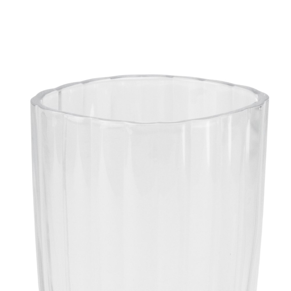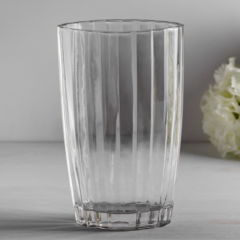 Ця скляна ваза — приклад того, як лаконічність може бути виразною. Прозоре скло з вертикальним або рельєфним візерунком надає виробу елегантності й легкості, не перевантажуючи інтер’єр. Такі форми пасуватимуть як сучасному мінімалізму, так і класичному стилю.