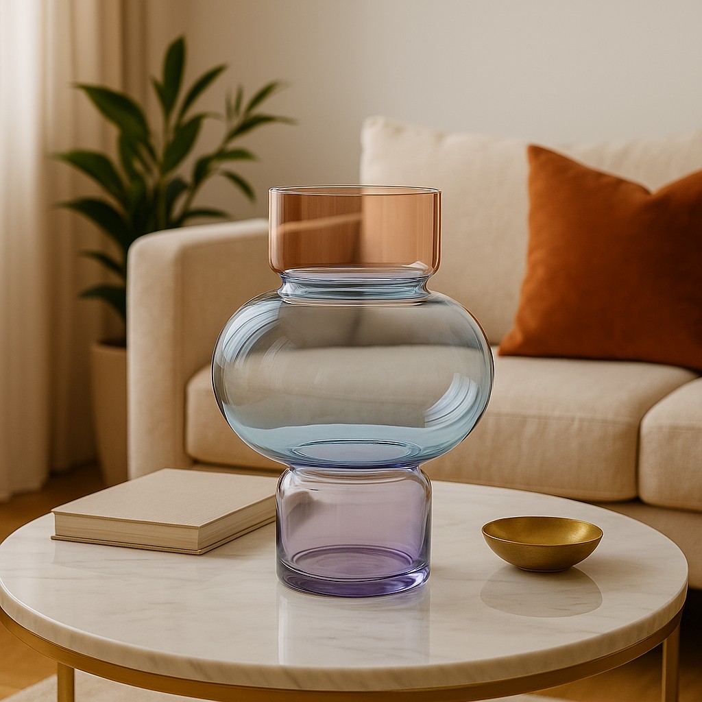Вази з колекції Ariadne "Murano" — це справжнє візуальне задоволення. Їхні плавні форми поєднуються з м’якими градієнтами кольору: від прозорого до рожевого, від блакитного до димчастого. Кожна ваза нагадує краплю скла, зупинену у моменті — легку, повітряну, глибоку.