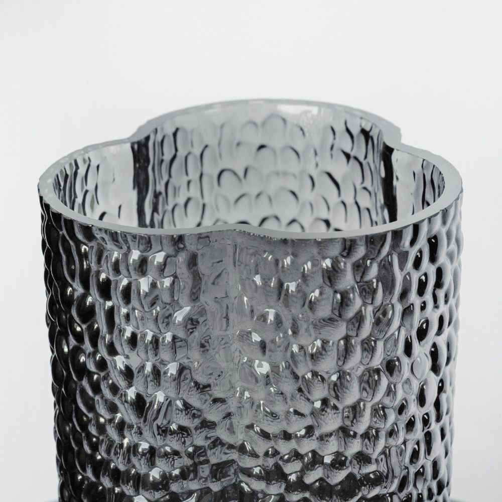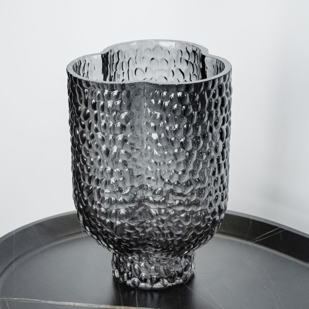 Эта стильная ваза выполнена из тонированного стекла чёрного цвета с выразительной текстурной поверхностью, напоминающей воздушные пузыри. Её уникальная форма с закруглёнными изгибами придаёт интерьеру динамику и современность. Благодаря компактным размерам, ваза идеально подойдёт как для одиночных цветов, так и в качестве самостоятельного декора.