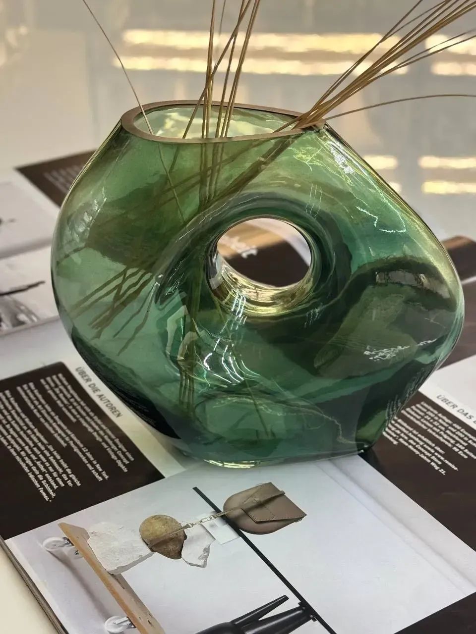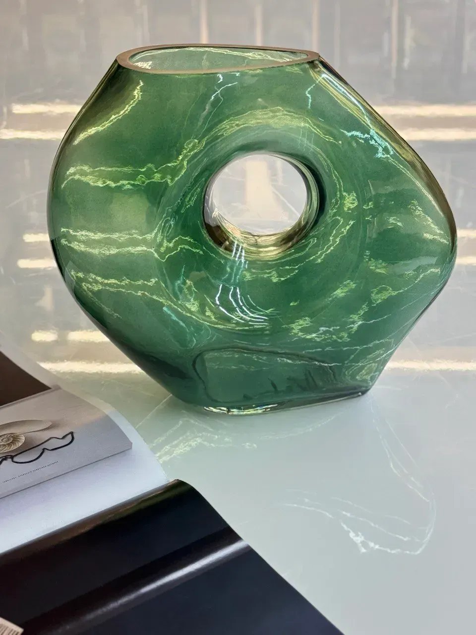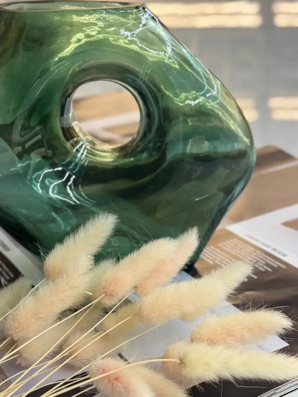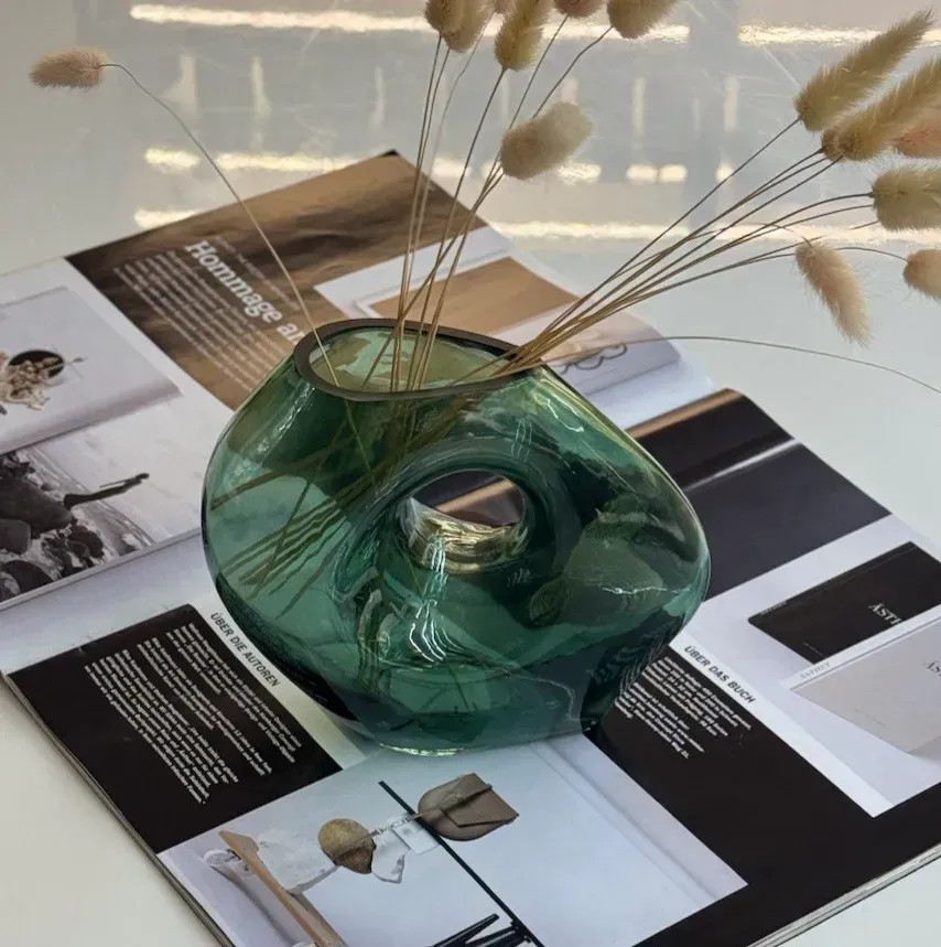 Каждая из этих ваз — не просто сосуд, а эстетическое высказывание. Их органические формы с выразительными отверстиями словно запечатлели момент движения. Матовое или прозрачное стекло с глубоким янтарным и изумрудным оттенком создаёт игру света, которая удивляет при любом освещении.