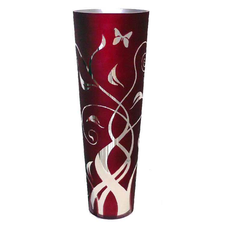 Ваза виготовлена зі скла у насиченому бордовому кольорі із зображенням справжнього танцю метеликів.