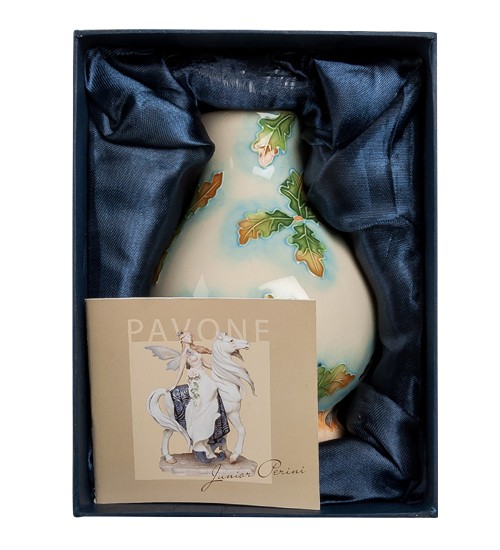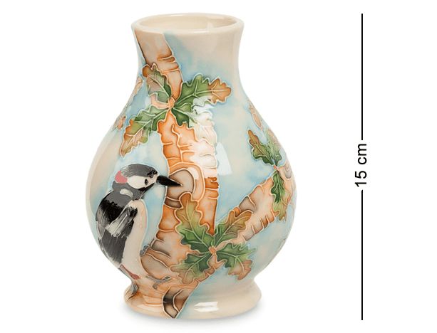 Эта небольшая вазочка удобна для того, чтобы поставить в нее не только цветы, но и лесной букет из листьев, который особенно красив осенью. Но даже если ваза пустует, она все равно служит украшением. На ее поверхности на фоне голубого неба изображен ствол дерева, судя по листьям – дуба. И на этом стволе устроился симпатичный дятел с красной головкой, стучит клювом по дереву, лечит его – жучков-червячков из-под коры достает, да и себе пропитание добывает. С такой вазой в комнате всегда будет царить лето, время зеленых листьев и птиц. Это может быть отличным подарком кому угодно, ведь природу любят все.