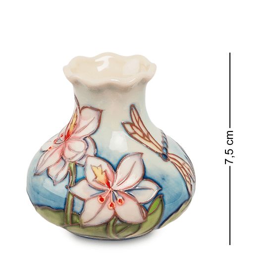 У вазы узкое горлышко и широкое основание. В нее можно поставить цветок на коротком стебле или положить что-то ценное. Внешняя поверхность горшочка покрыта голубой краской, а на ее фоне изображены большие светло-розовые цветы с острыми лепестками и крупная стрекоза. Голубой фон, очень яркие цветы, контур которых усилен золотой краской, толстые стебли и фон из зеленых листьев создают ощущение фантасмагории, нереальности происходящего. Привычный летний пейзаж ассоциируется с утопическими идиллиями, которые часто создают в своих произведениях писатели-фантасты.