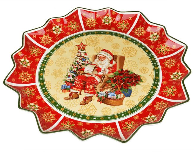 Велике фарфорове блюдо Christmas Collection діаметром 38 см — це яскравий акцент святкового столу, який поєднує в собі елегантність і атмосферу Різдва. Розкішна форма з хвилястими краями та насичене червоне оформлення із золотими сніжинками створюють відчуття тепла й домашнього затишку. Центральне зображення Санти поруч із різдвяною ялинкою наповнює композицію радістю, нагадуючи про сімейні традиції, очікування дива та подарунків.
