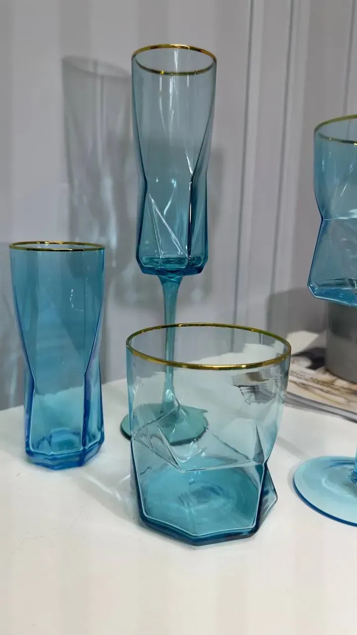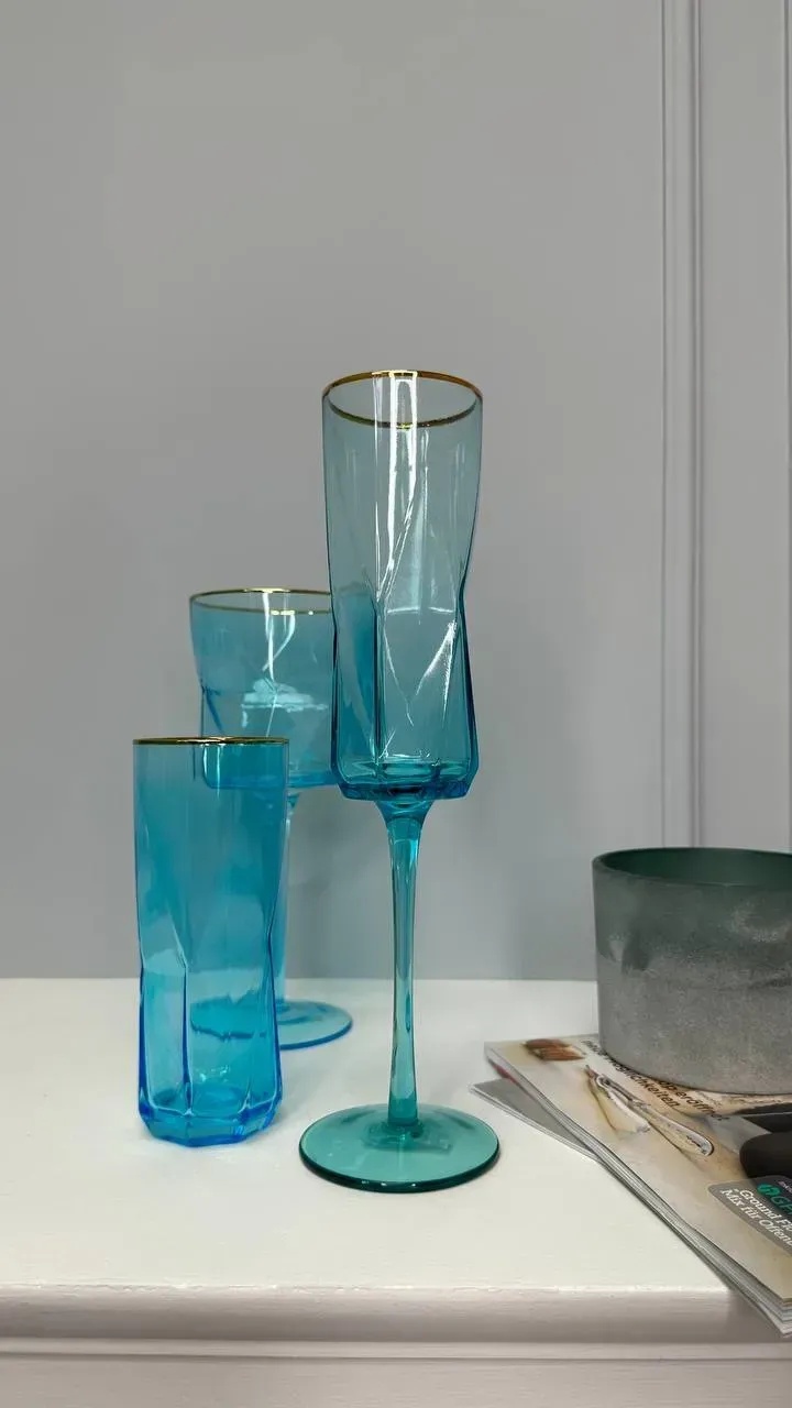 Ці келихи й склянки наче створені, щоб підкреслити характер кожного напою — чи то лимонад із льодом, ігристе шампанське, чи просто вода з часточкою лимона. Прозорі грані бавляться світлом, а ніжний блакитний колір ніби переносить вас до ранкового узбережжя — де спокій, чистота та глибина.