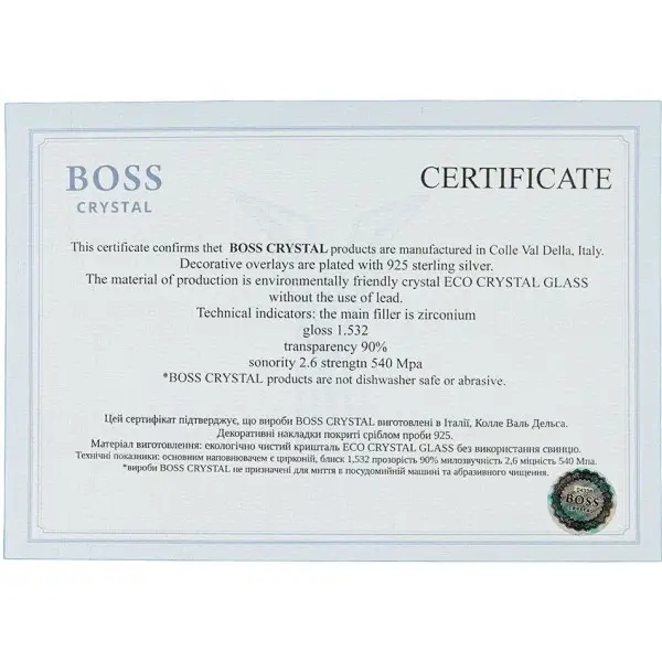 В комплект входят графин и шесть рюмок, выполненные из экологически чистого итальянского хрусталя без содержания свинца. Каждый элемент украшен вставками из серебра 925 пробы, покрыт золотом 24 карата и дополнен платиновыми деталями, что придаёт изделию по-настоящему роскошный вид.