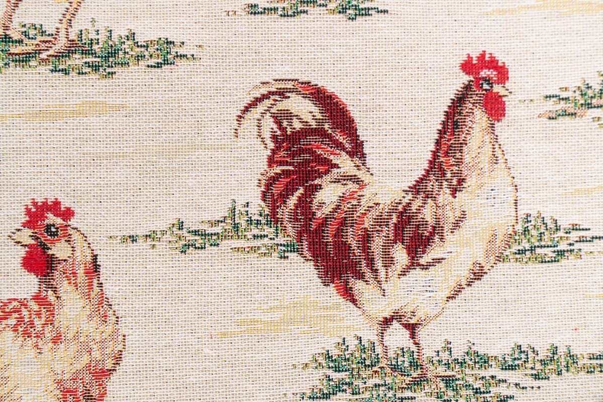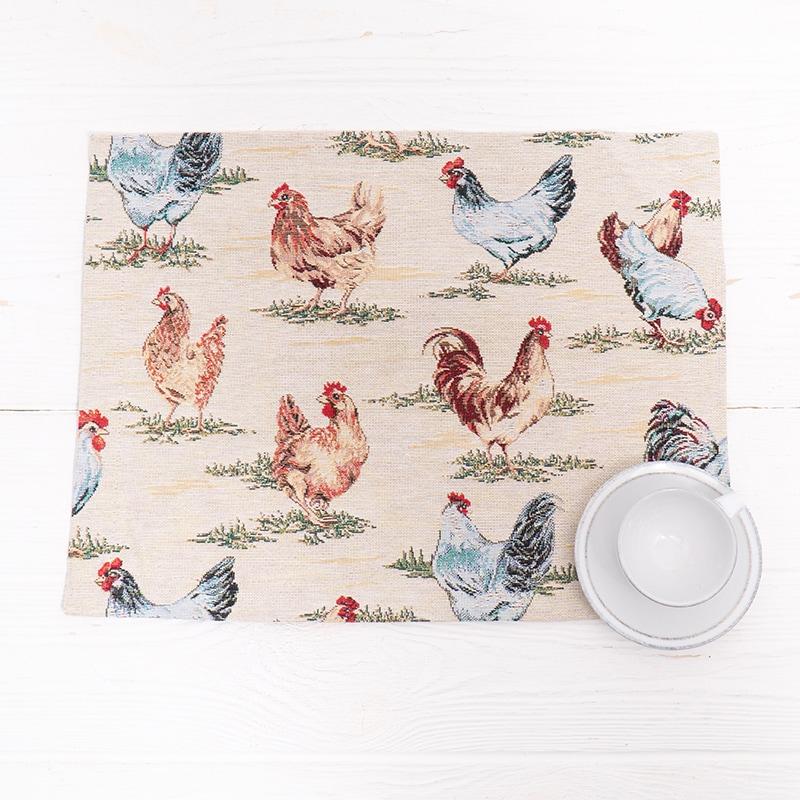 Салфетка изготовлена из качественного прочного испанского гобелена. На всей поверхности изображены курочки, клюющие зерно и травку. Качественный текстиль практичен и долговечен, после многократных машинных стирок не теряет форму и насыщенность цвета. Салфетка поднимет настроение и украсит не только стол, но и освежит интерьер.