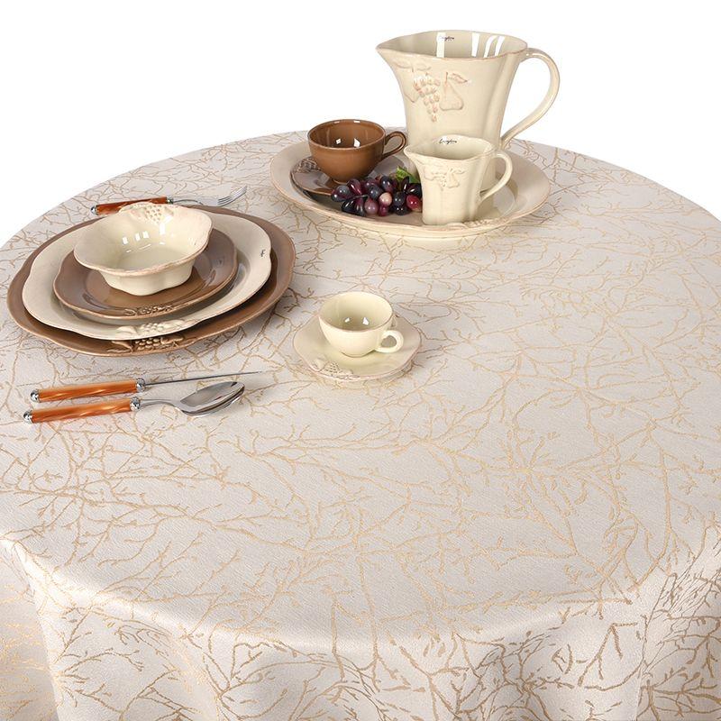 Плотная скатерть красиво спадает с края стола, образуя юбку со стойкими волнами. По кремовому полю с перламутровым отливом сотканы бежевые веточки с шелковистым блеском. Элегантный дизайн станет основой праздничной сервировки и не доставит хлопот в повседневном использовании. Тефлоновая пропитка обволакивает каждое волокно ткани, капли разлитого напитка собираются на поверхности – просто промокните их и скатерть останется сухой и чистой. Предлагаем 4 варианта размера данной модели.