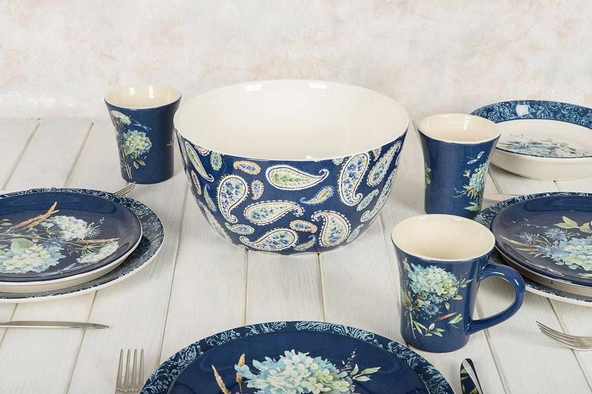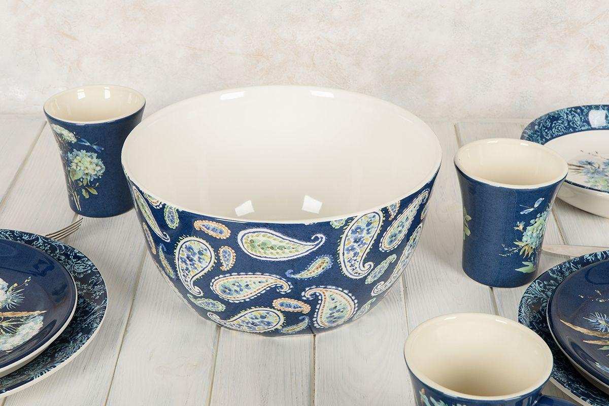 Керамический глубокий салатник из лимитированной коллекции «Синие цветы Богемии», авторство дизайна которой принадлежит популярной художнице Лизе Аудит добавит изюминку в интерьер кухни. Высокий салатник выполнен из прочной термостойкой керамики и годится для подачи как холодных, так и горячих блюд. Посуда выполнена в насыщенном темно-синем цвете с узорами пейсли с цветочными мотивами в восточном стиле. Основным элементом флористической композиции является цветущая голубая гортензия. Для комплекта можно приобрести салатник из этой же коллекции, но немного меньшего размера. Изделие можно загружать вместе с другой посудой в посудомоечную машину и применять для разогрева еды в микроволновой печи. От средств с агрессивными химическими ингредиентами и абразивными частицами лучше отказаться. Страна бренда США. Посуда производится на заводах компании Certified International в КНР.