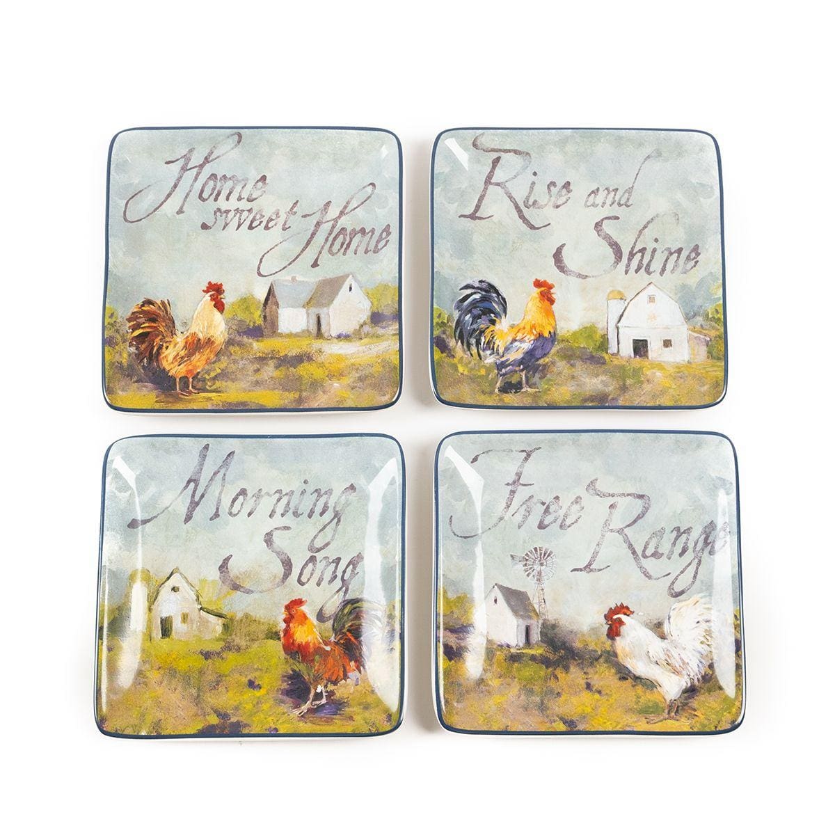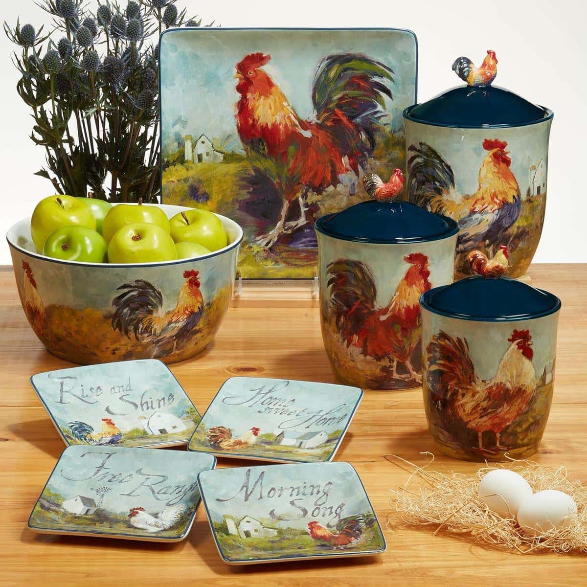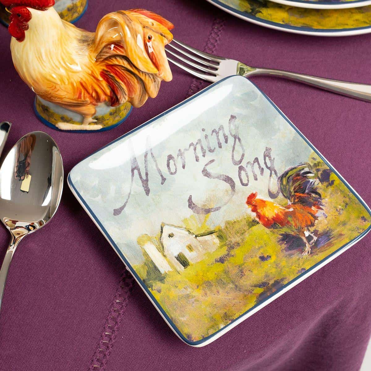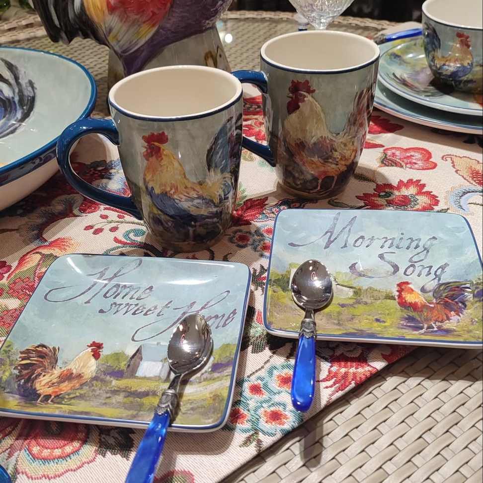 Тарілки виготовлені із надміцної екологічної кераміки преміум-класу. Авторський дизайн колекції створено популярною американською художницею Сюзен Уінгет. На кожній із тарілок зображено півня, а також мотиваційні написи. Фрази на тарілках допомагають створити атмосферу кантрі. Не рекомендується чистити засобами з абразивними частинками.