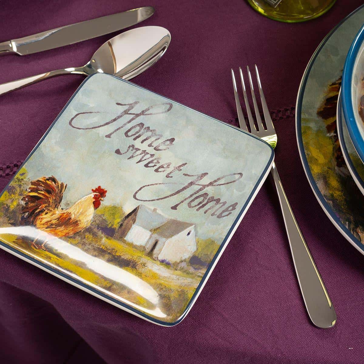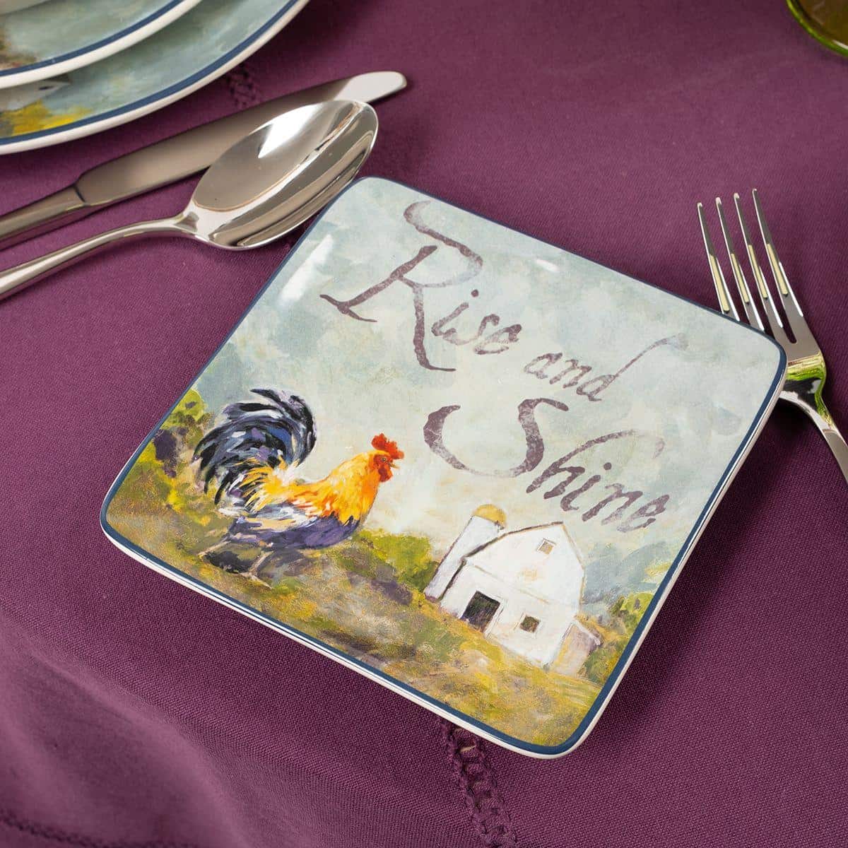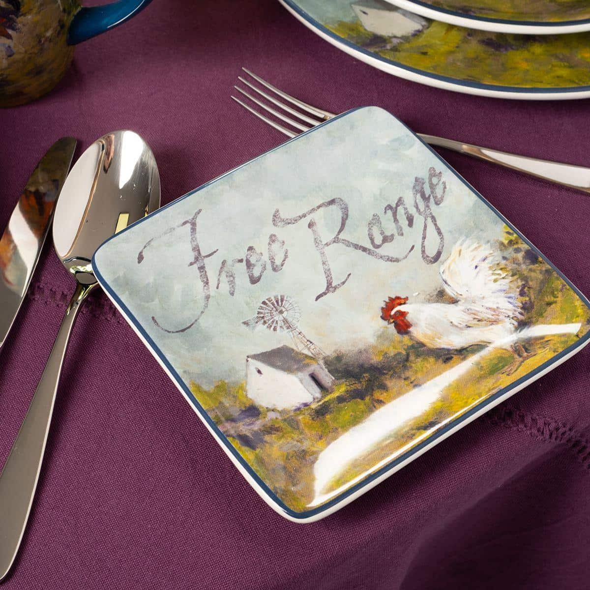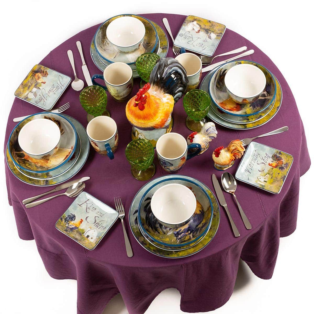 Тарілки виготовлені із надміцної екологічної кераміки преміум-класу. Авторський дизайн колекції створено популярною американською художницею Сюзен Уінгет. На кожній із тарілок зображено півня, а також мотиваційні написи. Фрази на тарілках допомагають створити атмосферу кантрі. Не рекомендується чистити засобами з абразивними частинками.