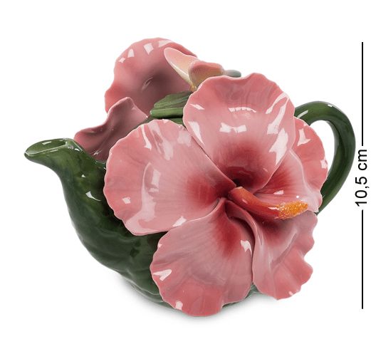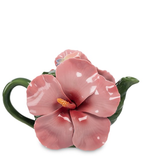 На темному зеленому тлі свіжого листя розпустилися розкішні рожеві квіти. Не відразу можна вгадати, що дві прекрасні квітки майже повністю затуляють собою невеликий чайник для заварювання – саме його зелений колір і нагадує про літнє листя. Ручка його нагадує стебло, а кришечка – зелений лепесток, на який опустився бабочка з рожевими, як і квіти гібіскуса, крильцями. У Китаї багато сортів чаю ароматизують квітковими лепестками, а якщо ви будете заварювати чай серед таких розкішних квітів, але вам здаватиметься, що навіть звичайнісінький чорний чай пропах нежним китайським ароматом і став набагато смачнішим.