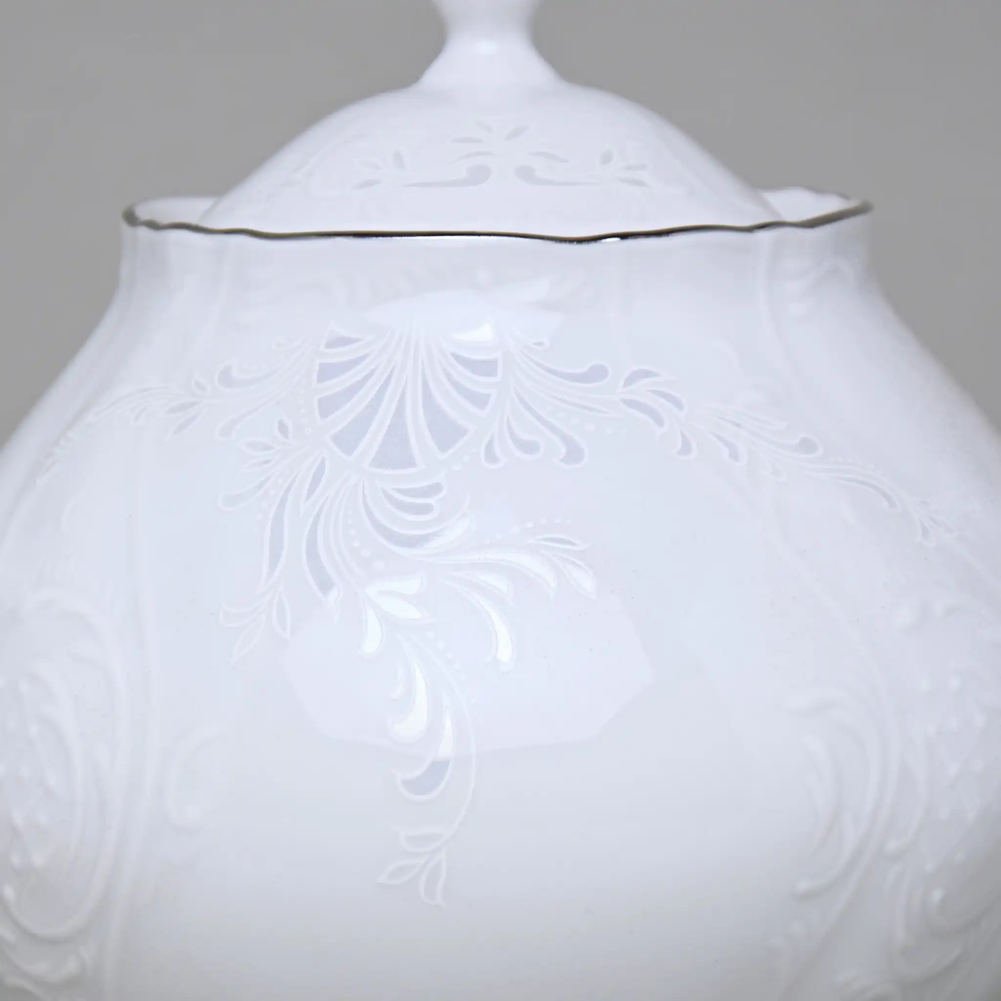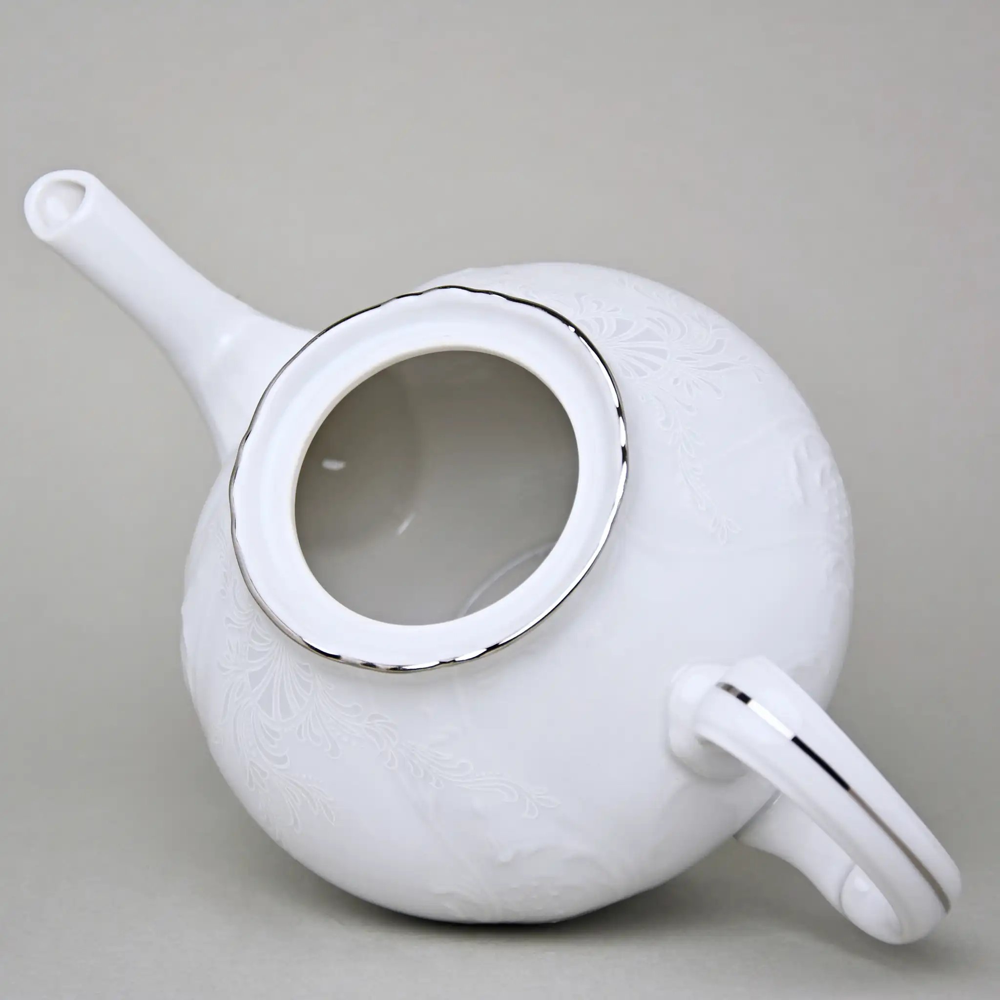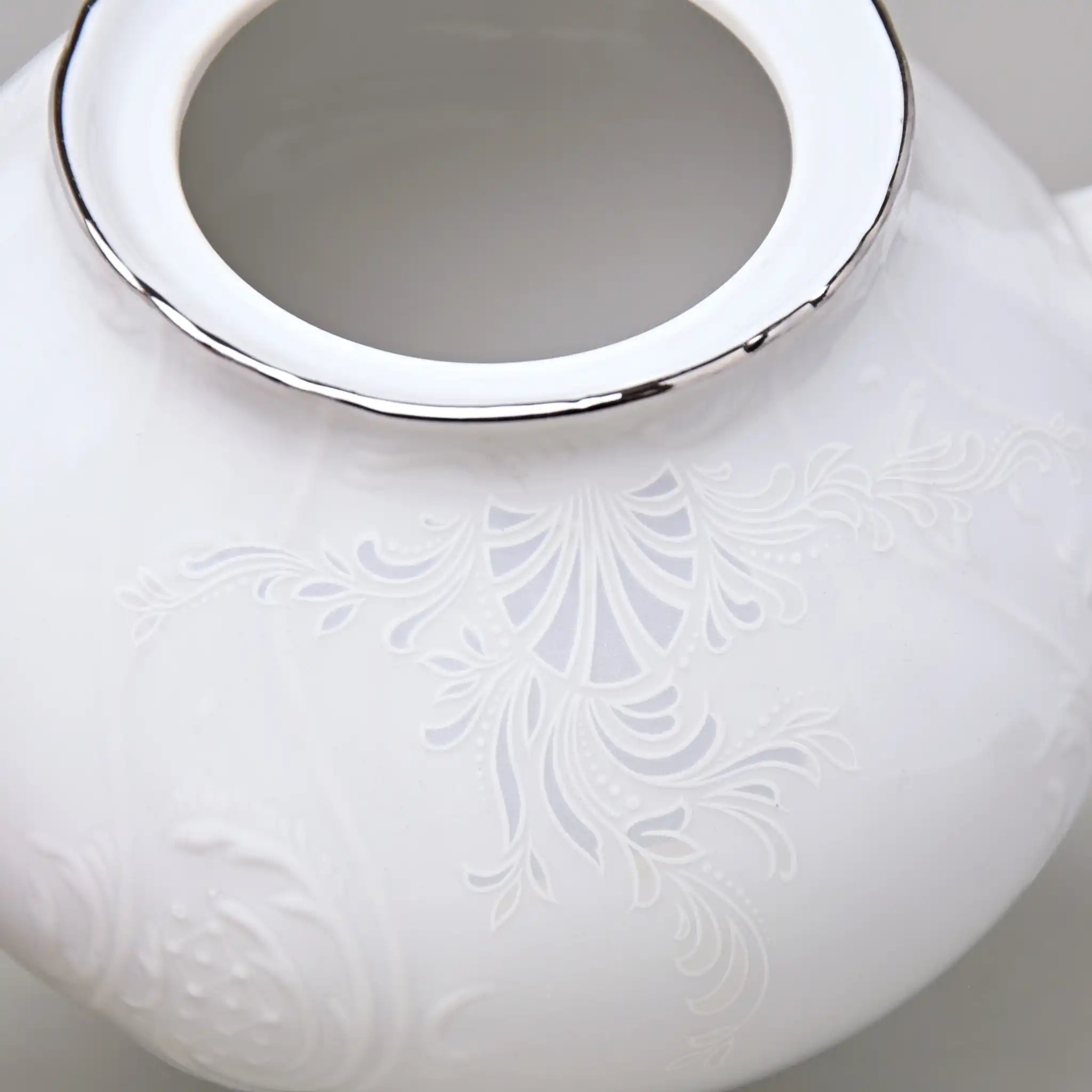 Форма чайника — округла, класично-аристократична, з плавними лініями та зручним вигнутим носиком. Покритий молочно-білим глазурованим шаром з вишуканим рельєфом, він виглядає розкішно і водночас нейтрально, пасуючи до будь-якої сервіровки. Сріблястий кант на кришці надає виробу виразності та елегантності, не перевантажуючи його декором.