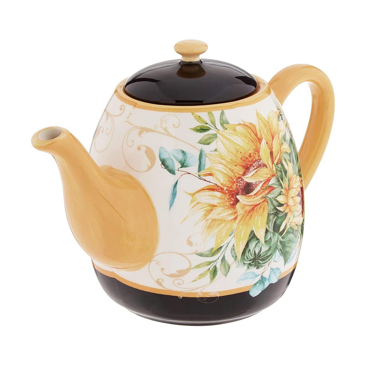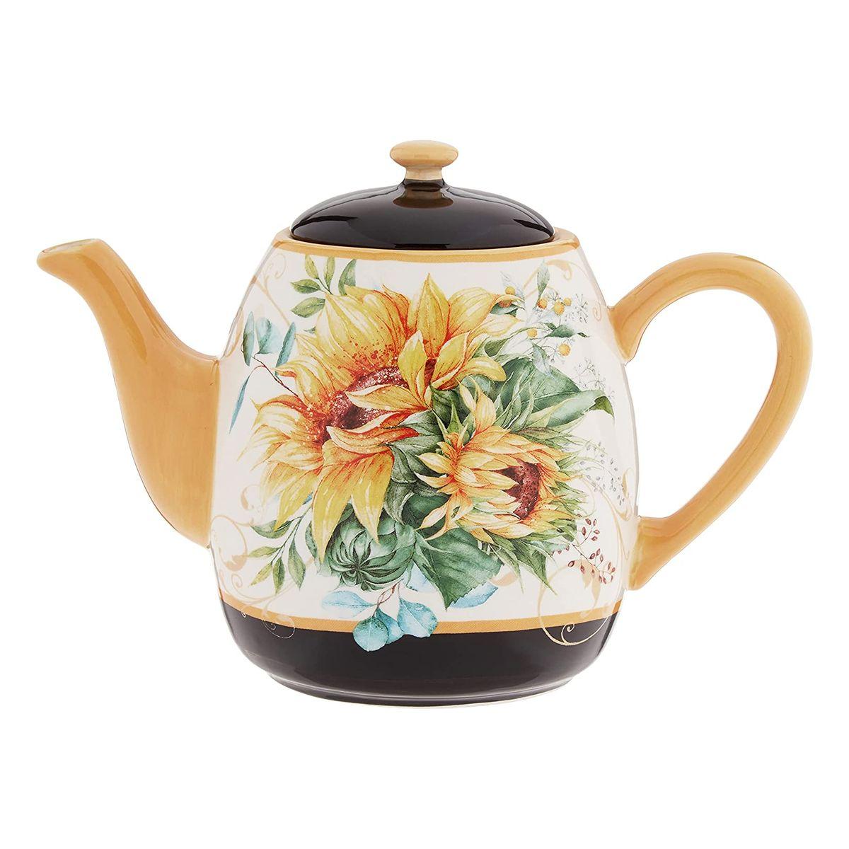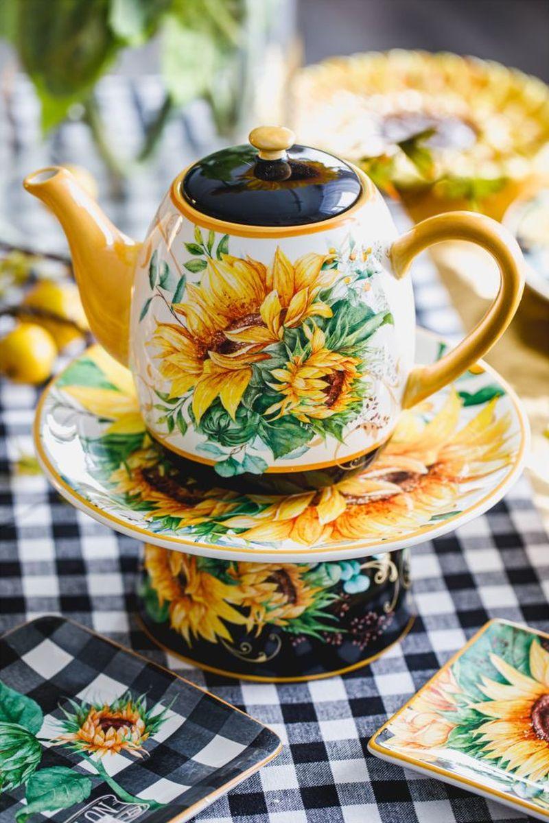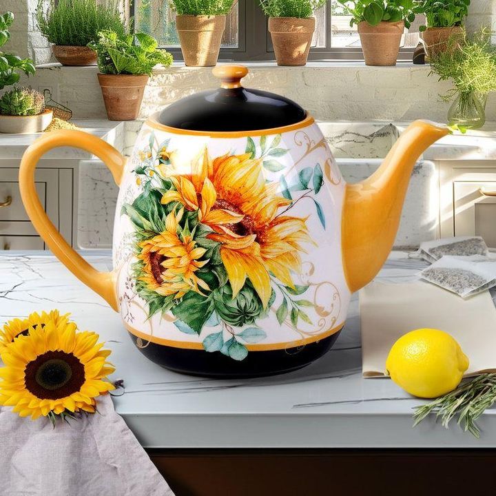 Заварник із колекції «Букет соняшників» внесе в атмосферу чаювання теплі спогади про літо. На білій кераміці зображені яскраві соняшники. Пишні квіти вдало контрастують із чорною облямівкою біля основи та кришкою заварювального чайничка. Носик та ручка пофарбовані у охровий колір. Дизайн виробу створила популярна художниця з Америки Ненсі Мінк. На міцній кераміці малюнок виконаний в акварельній техніці з детальним промальовуванням всіх елементів. На барвистий малюнок нанесена спеціальна глазур, яка захищає та надає розкішного сяйва заварнику.
