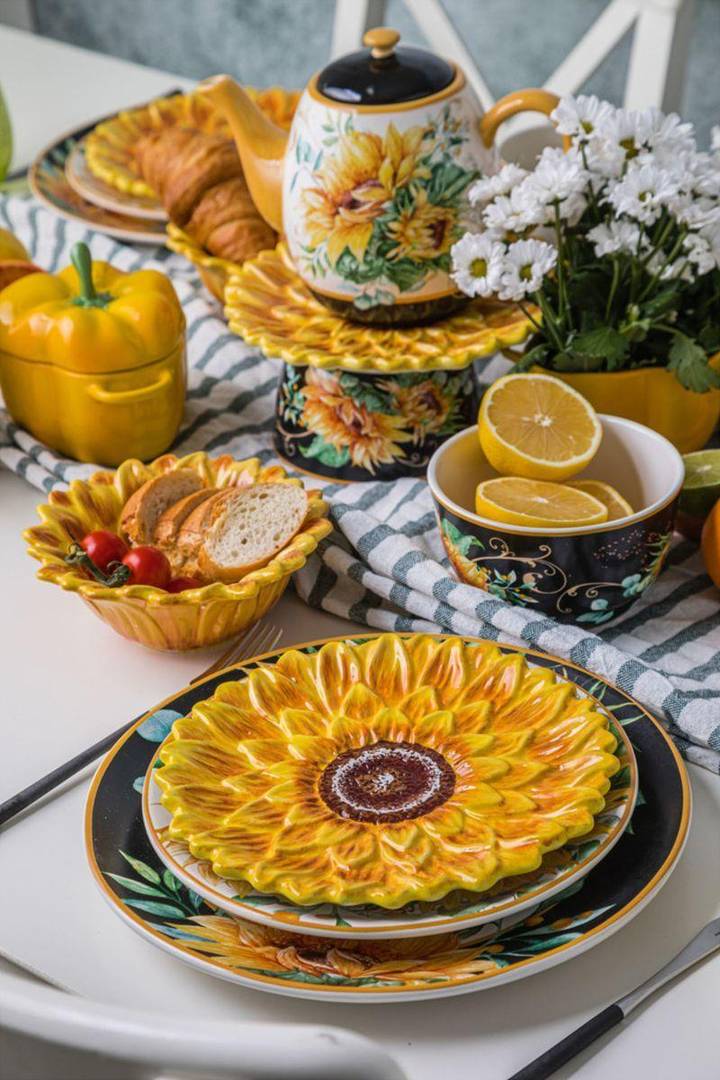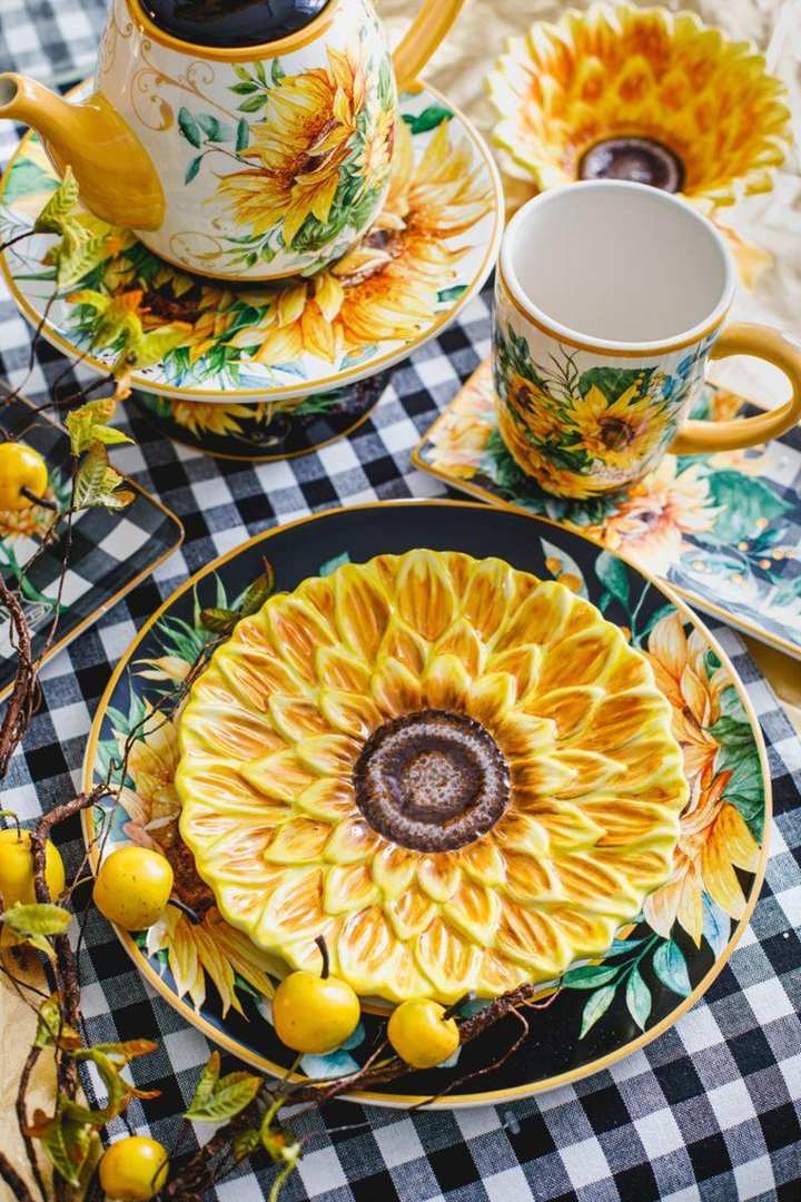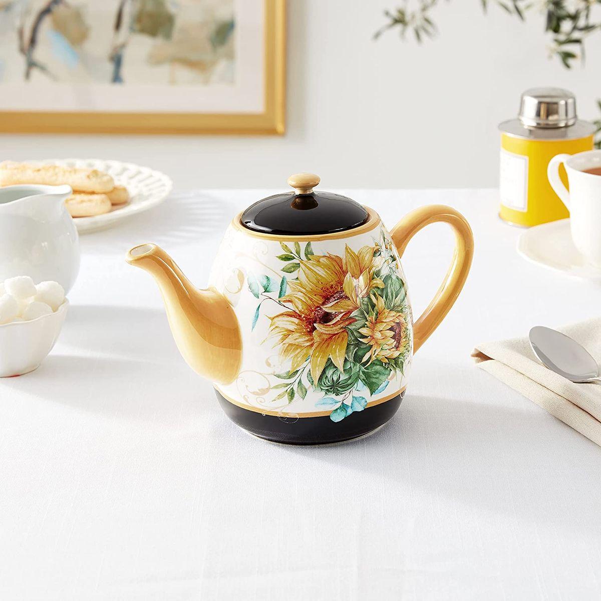 Заварник із колекції «Букет соняшників» внесе в атмосферу чаювання теплі спогади про літо. На білій кераміці зображені яскраві соняшники. Пишні квіти вдало контрастують із чорною облямівкою біля основи та кришкою заварювального чайничка. Носик та ручка пофарбовані у охровий колір. Дизайн виробу створила популярна художниця з Америки Ненсі Мінк. На міцній кераміці малюнок виконаний в акварельній техніці з детальним промальовуванням всіх елементів. На барвистий малюнок нанесена спеціальна глазур, яка захищає та надає розкішного сяйва заварнику.