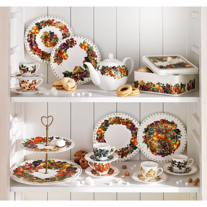 Ви любите чай, а чай любить кераміку. Немає кращого посуду для заварювання найароматнішого напою, ніж чайник з міцними керамічними стінками. Білосніжні округлі боки прикрашені соковитим натюрмортом – наче до букета чайного листа додаються фруктові нотки. Об’єму заварника вистачить на пару чашок, краще якщо вони будуть з цієї ж колекції.