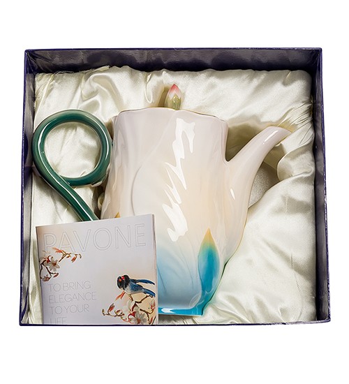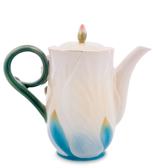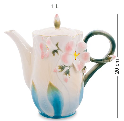 Мабуть, такі чайники ростуть на деревах. Ручка як химерна втеча робить петлю і закінчується бутоном. На кришечці теж бутон. А на самій поверхні чайника, як на дивному стволі, розпустилися рожеві квіти герані. Не втрималися в межах поверхні, випустили рожеві пелюстки у навколишній простір. І сам чайник нагадує химерну квітку, яка розпустилася на вашому столі, привносячи атмосферу свята.