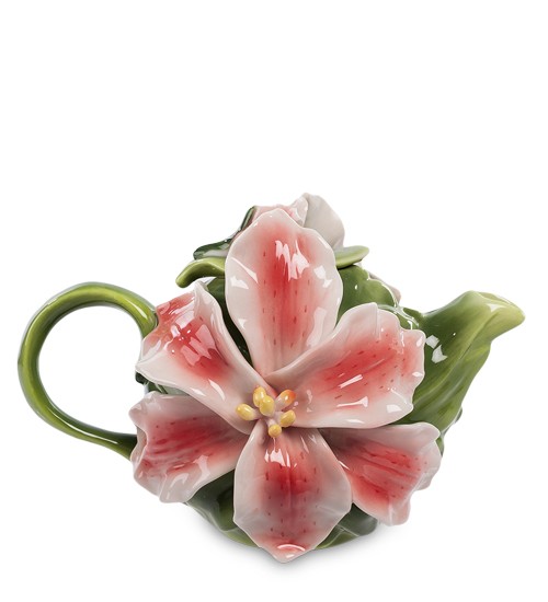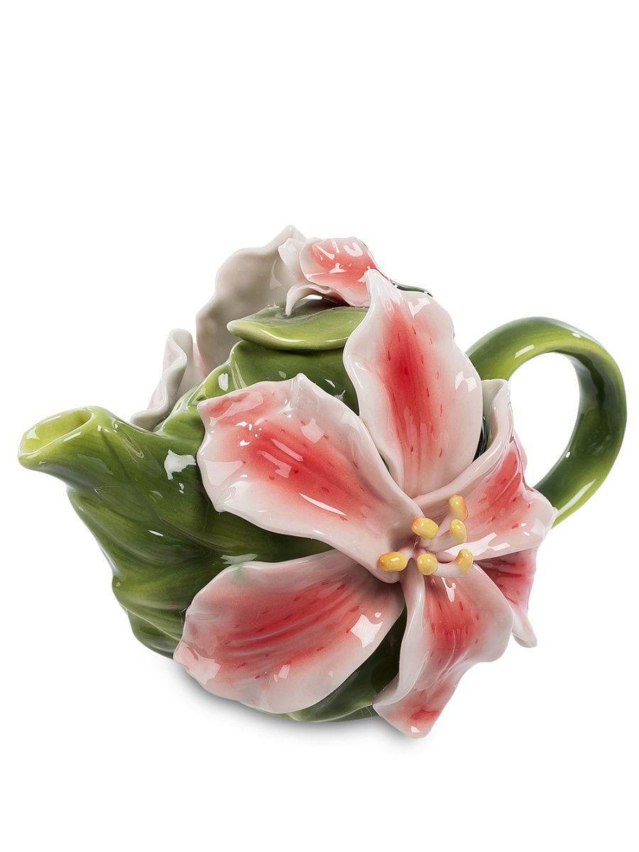 Чай чудово вбирає запахи і його часто ароматизують пелюстками квітів, отримуючи своєрідні ароматні букети. Саме про це нагадує чайник для заварювання, прикрашений розкішними квітами лілії. З двох боків на чайнику – по великій квітці, кришка – зелений лист з букетом квітки на ньому. Здається, від самого чайника вже виходить приємний аромат квітів. А якщо до нього додасться букет запахів самого чаю, враження буде незабутнім. Такий чайник – чудова прикраса будь-якого столу, центр компанії, що зібралася для чаювання. Або чудовий подарунок любителю чаю.