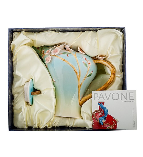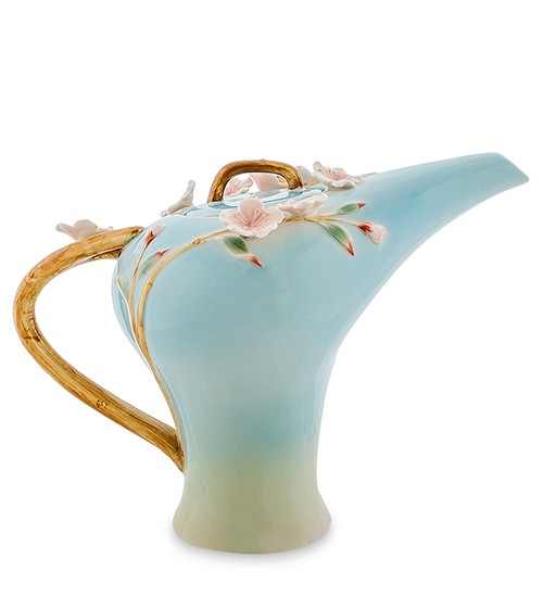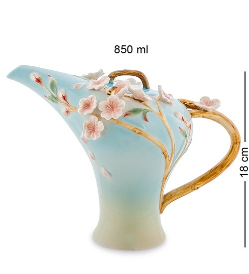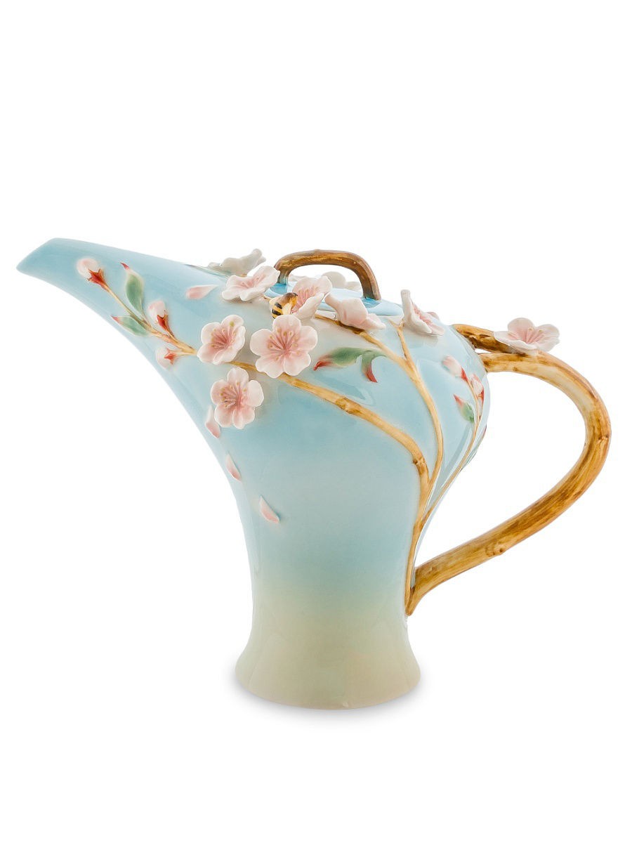 В нежной, спокойной, теплой цветовой гамме было решено выполнить этот чайник, и это решение оказалось правильным. Нежные цветки сакуры, расположившиеся на изящной ветке — идеальный орнамент для таких цветов, и изделие становится невероятно гармоничным и привлекательным. Красота, нежность, мягкость линий — отличительные черты этого уютного чайника, который способен придать кухне и чаепитию особенный колорит с восточными нотками.
