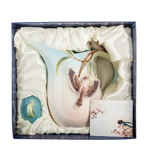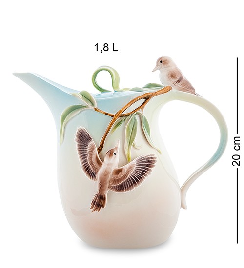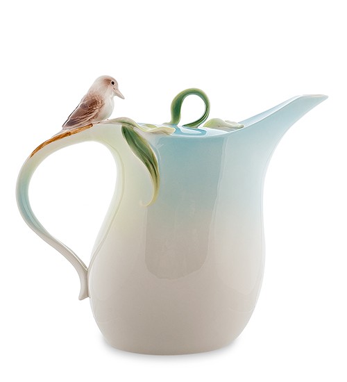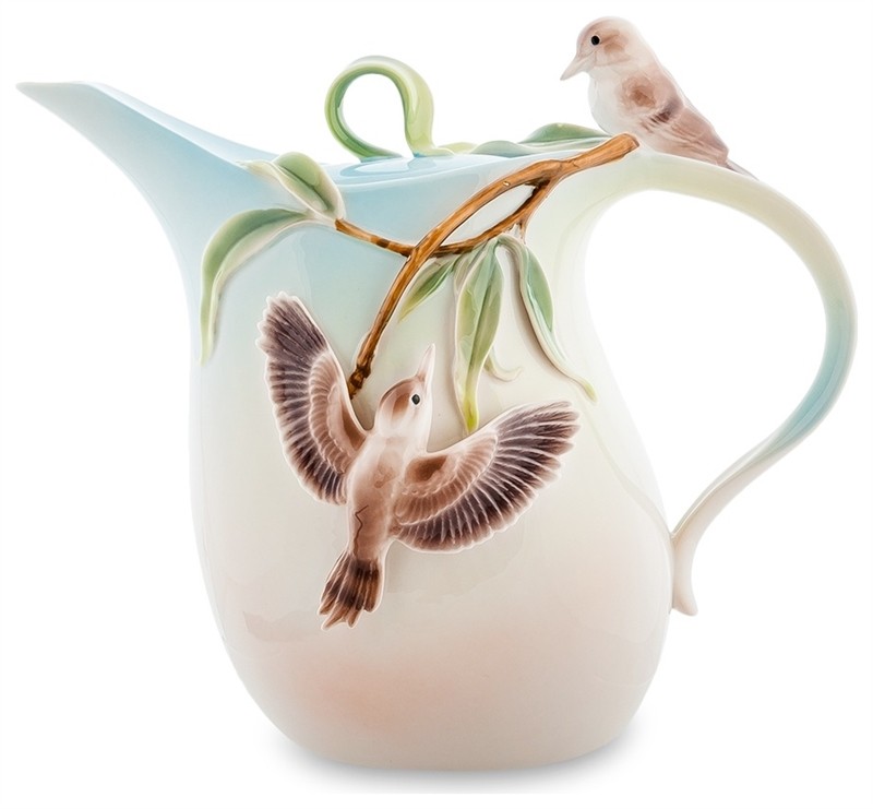 Зимородки живуть біля води. Вода може бути блакитною, як ясне небо, і рожевою на світанку. Два ці відтінки перетікають один в інший, і десь на межі кольору лягла на кришечку та ручку чайника гілка дерева, звісила свої пагони вниз.